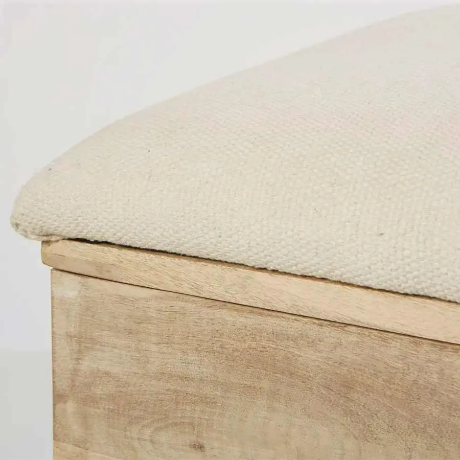 Banquette coffre 2 places en bois manguier et assise en coton écru. Profitez l’espace de rangement supplémentaire grâce au coffre caché sous l’assise. Tendance hygge venue du Danemark.