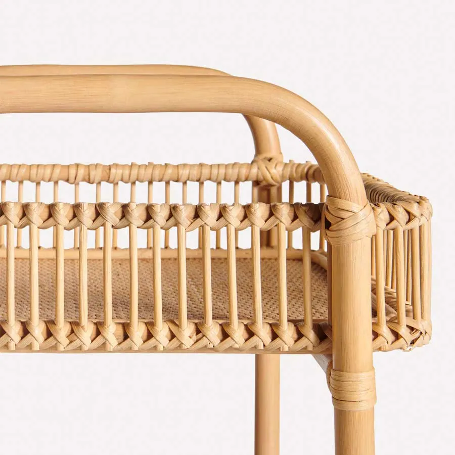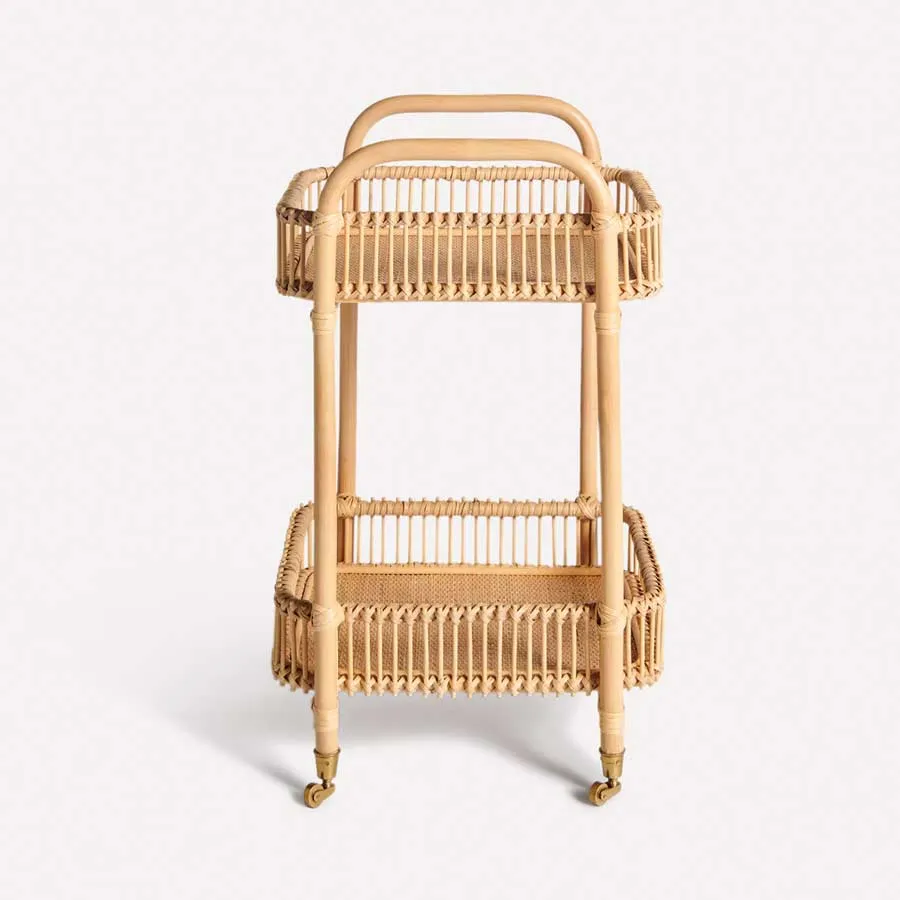 Bonito carro de servicio o camarera, fabricado con ratán natural. Dispone de ruedas con acabado dorado y dos baldas.