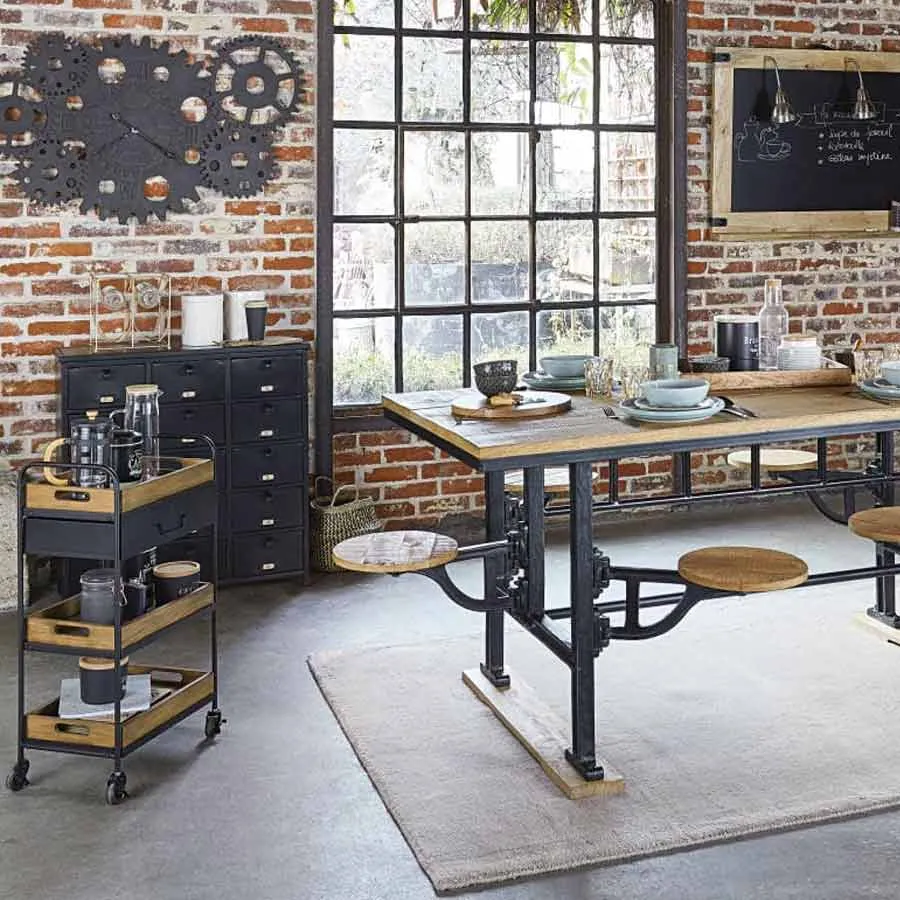 Carro con estructura metálica negra y tres bandejas de madera de abeto.