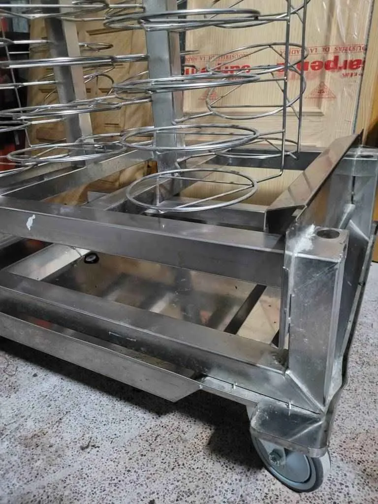 Carro porta platos cuya estructura está fabricada en metal de color gris plateado. Se trata de un práctico carro en el que se pueden transportar multitud de platos de diferentes tamaños. Es un carro con cuatro ruedas y una cómoda asa en la parte superior para transportarlo con mayor facilidad. Es ideal para cualquier negocio hostelero. Como se ve en las imágenes está en buen estado.