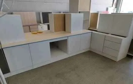 Mueble de cocina en forma de L, muy completo y nuevo a estrenar. Está compuesto de varios módulos con cajones y puertas y tiene una gran capacidad de almacenaje. Tiene una parte baja con encimera y hueco para colocar el horno. Se trata de un mueble de buena calidad con un diseño muy original, ideal para darle un toque moderno a la cocina. Disponemos de varios colores como se puede ver en las fotografías.