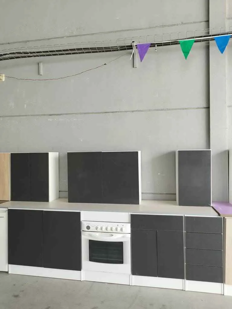 Mueble de cocina recto muy completo nuevo a estrenar. Está compuesto de varios módulos con cajones y puertas y tiene una gran capacidad de almacenaje. Tiene una parte baja con encimera y hueco para colocar el horno. Se trata de un mueble de buena calidad con un diseño muy original, ideal para darle un toque moderno a la cocina. Disponemos de varios colores como se puede ver en las fotografías.