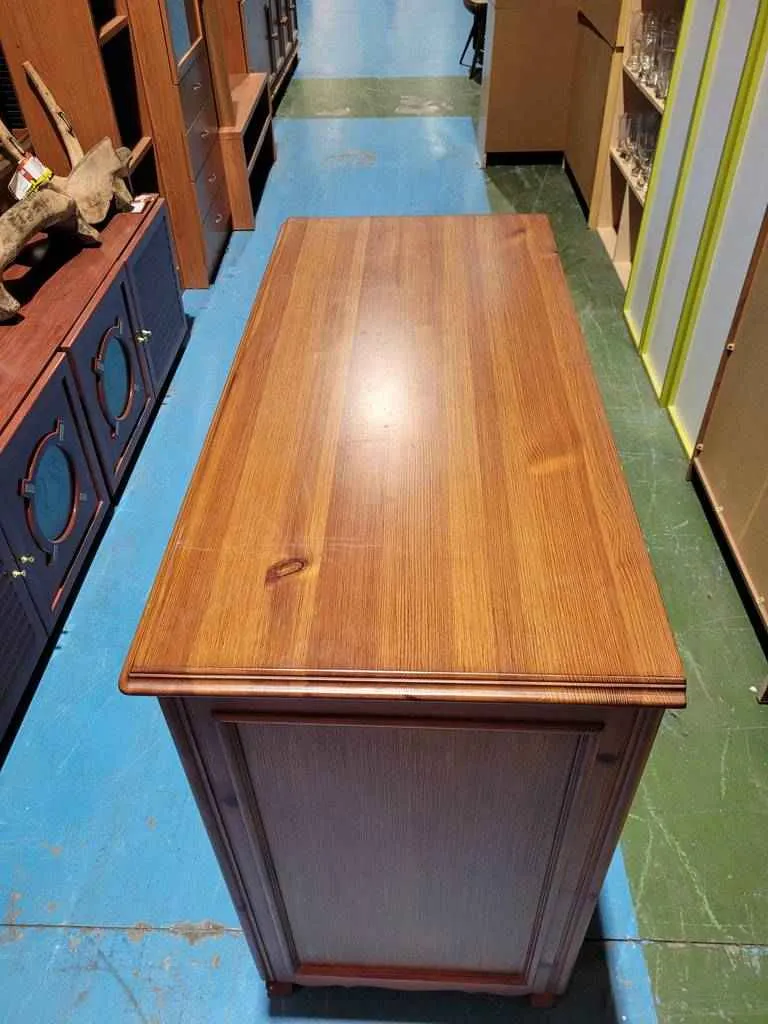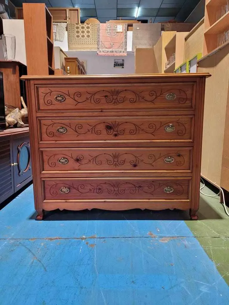 Cómoda muy bonita y elegante que ha sido realizada con madera de buena calidad y robusta. Dispone en la parte frontal de cuatro amplios cajones que incorporan cada uno de ellos dobles tiradores para abrirlos fácilmente. Es una cómoda ideal para colocar en un dormitorio o vestidor. Como podemos observar en las fotografías presenta rasguños.