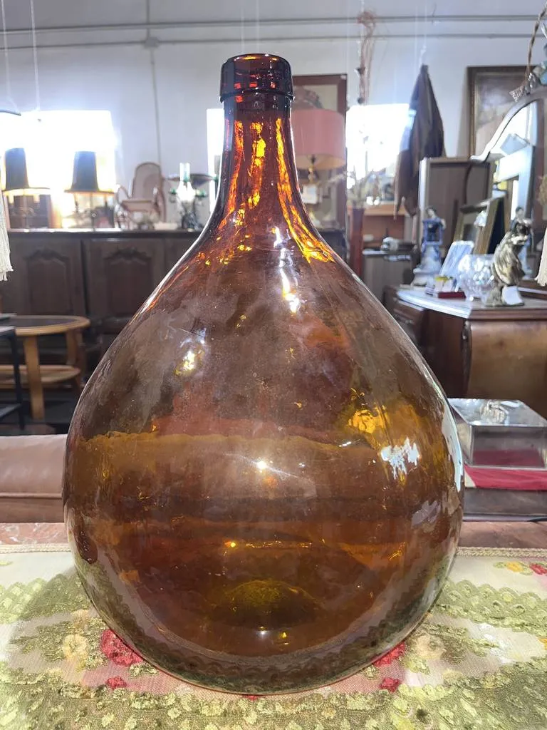 Damajuana fabricada en vidrio de buena calidad de color marrón oscuro. Se trata de un recipiente de vidrio de vientre voluminoso y redondeado y cuello corto que sirve para contener líquidos de distinto tipo. Es una damajuana ideal para usarla como elemento decorativo tanto en espacios abiertos como cerrados. Como se puede observar en las fotografías se encuentra en buen estado.