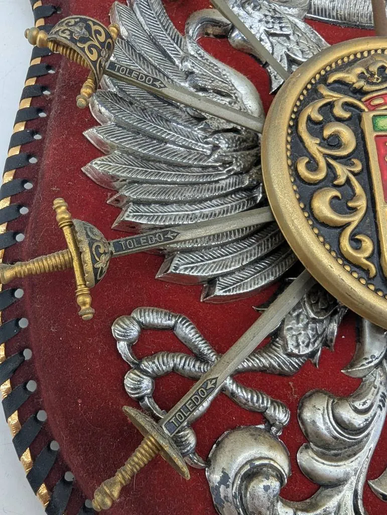 Escudo medieval de estilo vintage y clásico fabricado en metales de buena calidad. Se trata de un escudo que lleva una insignia en la parte central con el escudo de España y está decorado con diversas espadas plateadas alrededor de él. Es un escudo ideal como elemento decorativo o para coleccionistas de este tipo de objetos. Como se puede observar en las fotografías se encuentra en buenas condiciones.