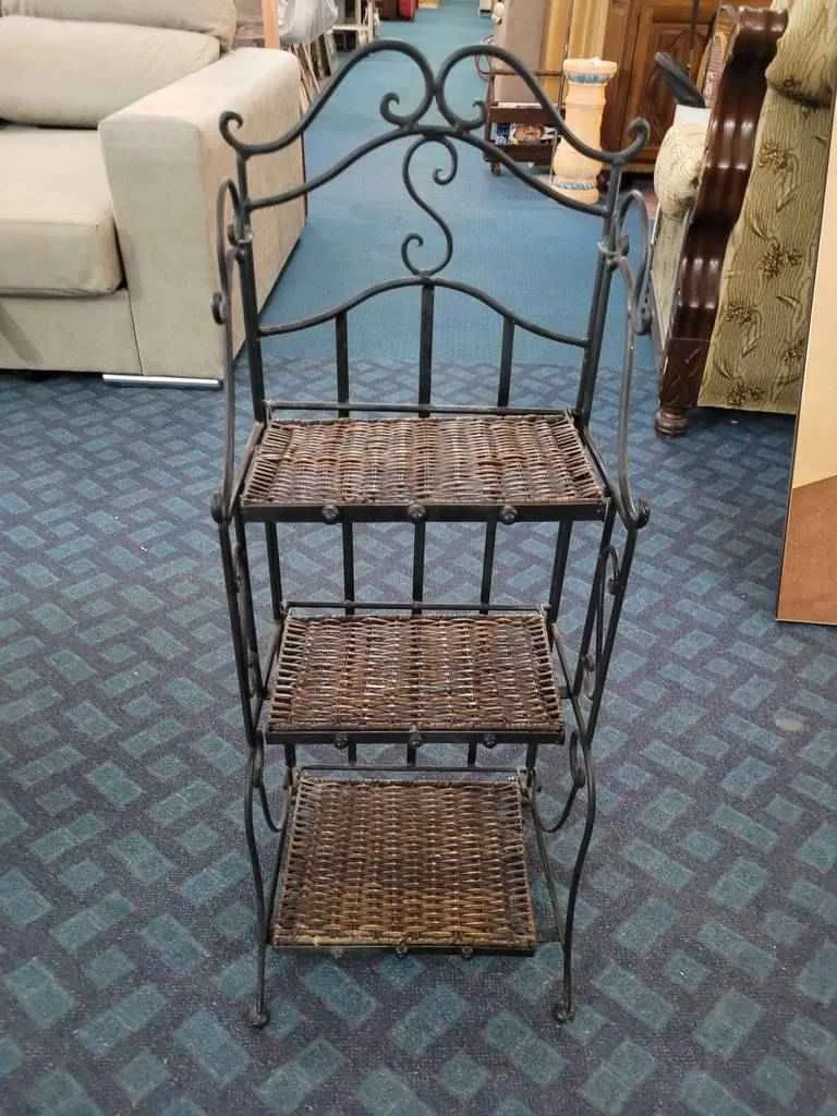 Estantería muy coqueta que dispone de una estructura realizada en metal de buena calidad y moldeado con bonitas formas que la hacen resaltar. Dispone de tres baldas de mimbre ideal para colocar múltiples enseres. La estantería se pliega fácilmente por lo que no ocupa mucho espacio cuando la utilizamos. Como podemos observar en las fotografías se encuentra en buen estado.