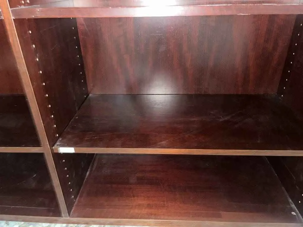 Estantería de gran tamaño, hecha de madera color marrón oscura. Se trata de un estante con multitud de baldas, las cuales se pueden utilizar para almacenaje o también como librería, ya que tienen las medidas perfectas para ello. Todas sus bandas son regulables en altura, para adecuar a cualquier necesidad. Es un mueble perfecto para colocar en un gran despacho o también en la oficina. Se encuentra bien cuidada como se puede ver en las fotografías.