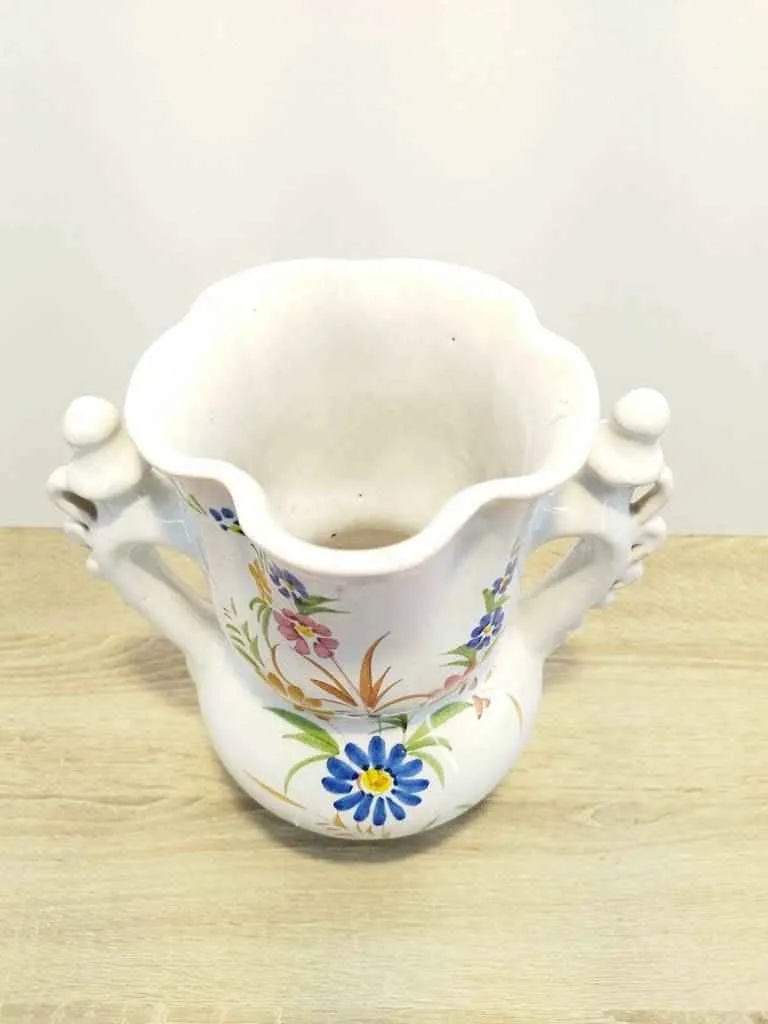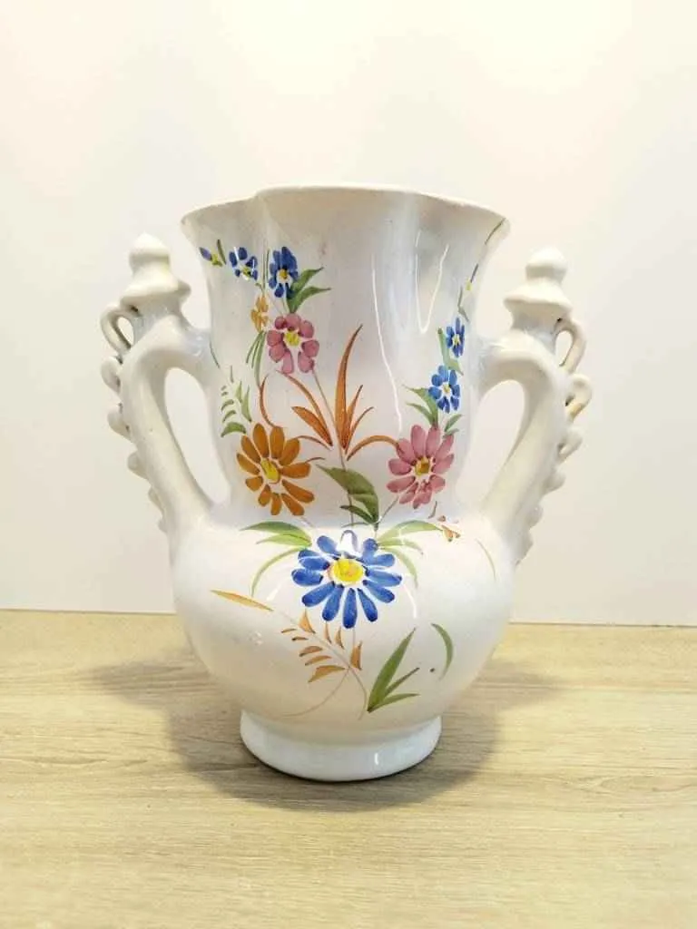 Jarrón decorativo hecho de cerámica color blanca. Dispone de dibujitos de estilo floral multicolor que le dan un toque especial. También tiene dos asas en los laterales para poder cogerlo fácilmente. Es perfecto tanto para la decoración del hogar como también para colocar unas bonitas flores en él. Tiene algún pequeño desperfecto, pero en general se encuentra bien cuidado.