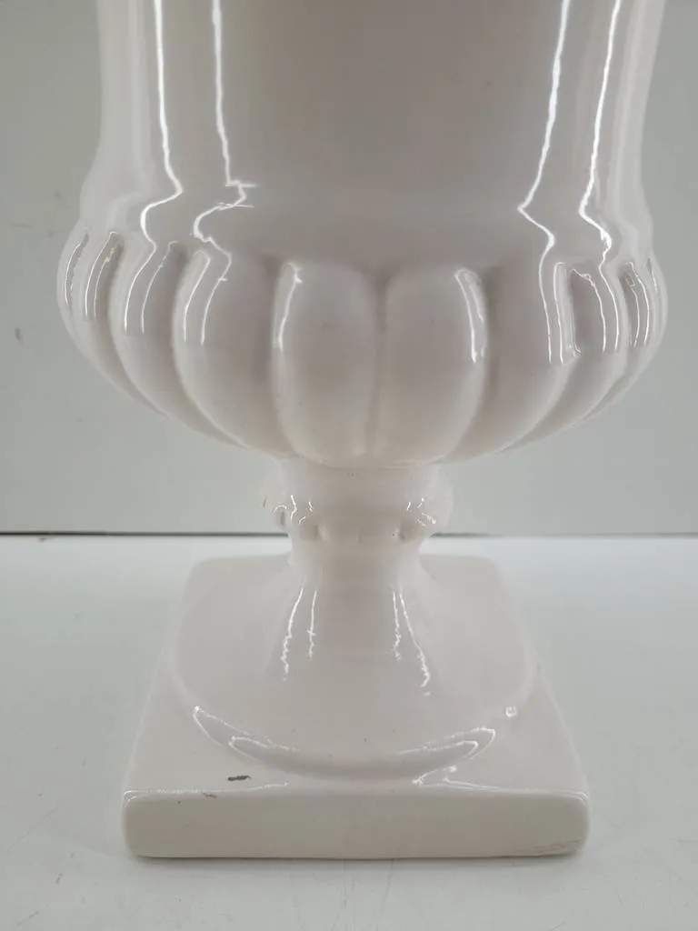 Jarrón de color blanco muy coqueto y bonito que ha sido fabricado en porcelana de buena calidad. En la parte superior dispone de una gran obertura para, por ejemplo, colocar unas bonitas flores en él. Su base cuadrada lo hace un jarrón muy estable. Es ideal para colocar en un recibidor o salón comedor. Como podemos observar en las fotografías se encuentra en buenas condiciones.