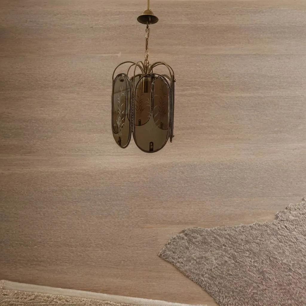 Lámpara de techo cuadrada con una gran pantalla en la parte baja de efecto mármol. Dispone de cuatro puntos de luz en el interior que cuando se encienden la hacen destacar. Está unida al techo por una varilla metálica plateada y por unos cables que conectan con la parte alta. Se encuentra bien cuidada y es perfecta para darle un toque original al salón de casa.