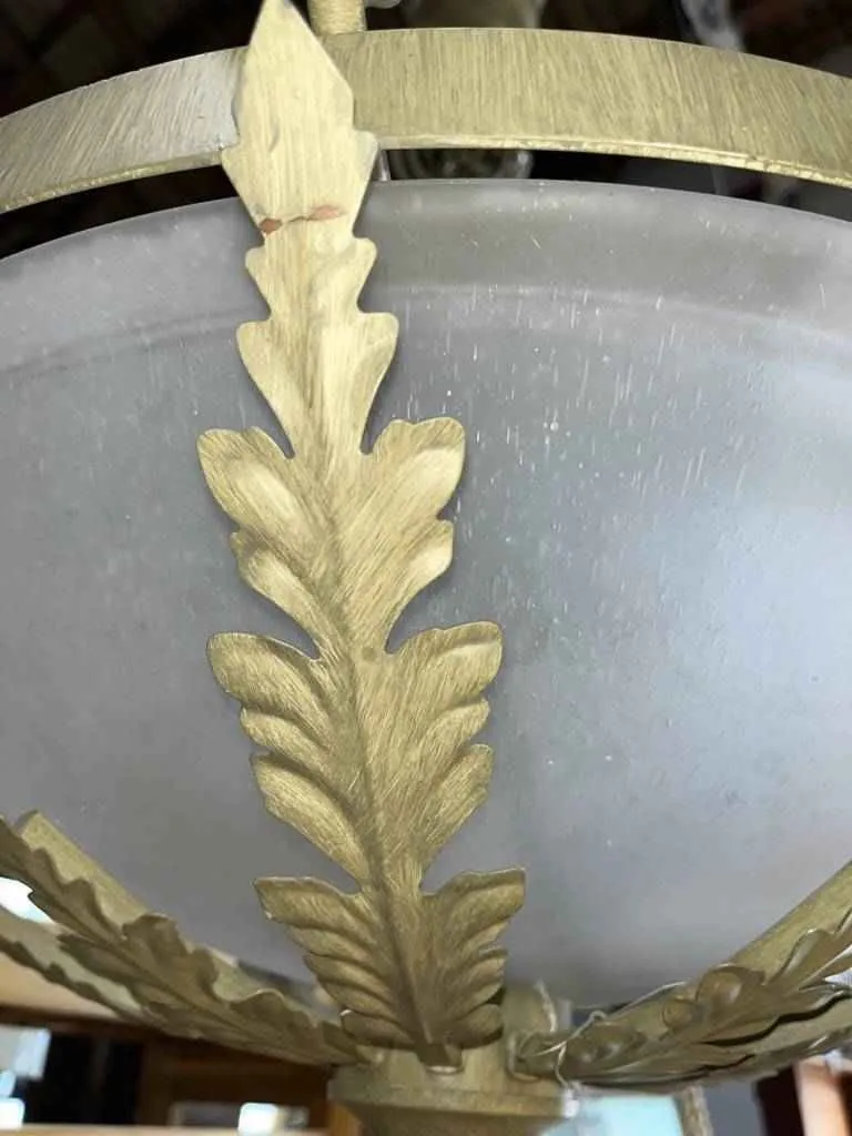 Lámpara de techo con un diseño muy original y con cuatro puntos de luz en la parte alta. En la parte central baja también tiene otros tres puntos de luz. En la parte inferior tiene un plafón de cristal color blanco y la estructura hace formas de hojas que la hacen destacar llamar la atención.