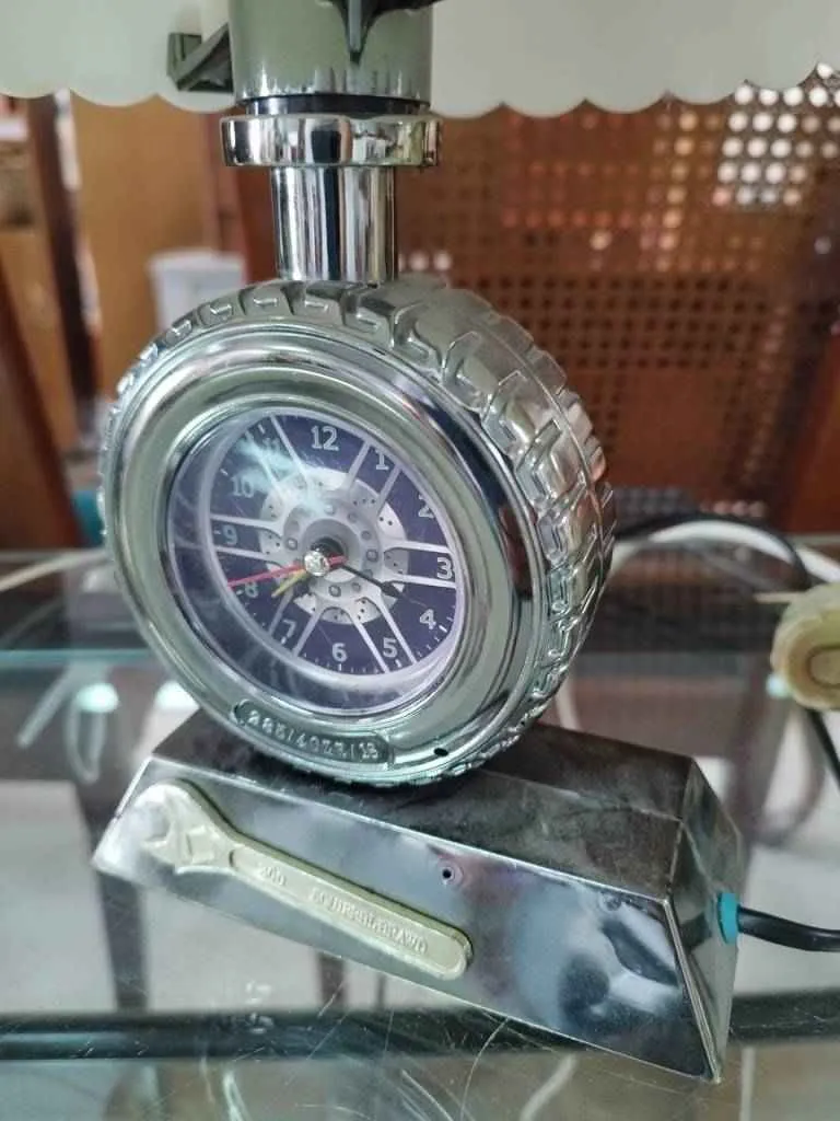 Lámpara despertador con un diseño muy original. Tiene un bonito reloj el cual tiene forma de rueda y una esfera con forma de llanta y fondo azul. La base de la parte baja es metálica y tiene una llave inglesa incrustada. En la parte superior tiene una bonita tulipa de cristal blanco en forma de paraguas. Se encuentra bien cuidada como se puede apreciar en las fotografías y es perfecta para darle un toque original al dormitorio.