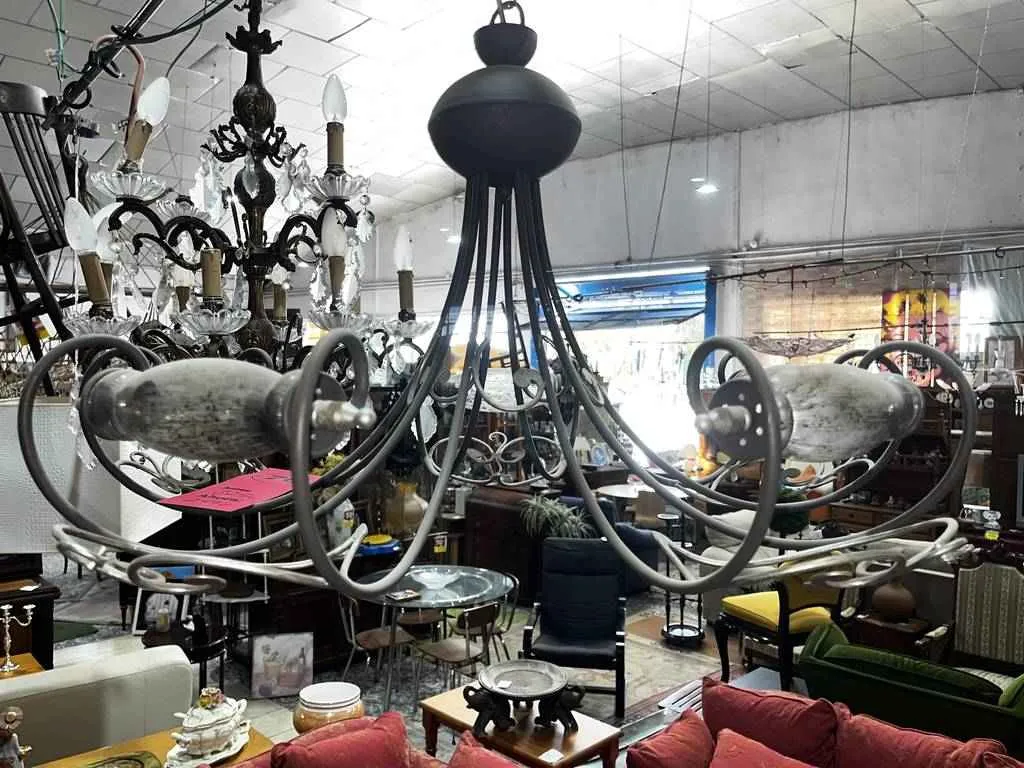 Lámpara muy bonita que tiene un diseño de lo más único. La estructura está realizada con metal de muy buena calidad. Dispone de distintos puntos de luz envueltos en cristal y con una estructura que las rodea haciéndolo un producto ideal para resaltar nuestro salón comedor y aportar esa elegancia faltante. Como podemos observar en las fotografías se encuentra en buenas condiciones y esta nueva a estrenar.