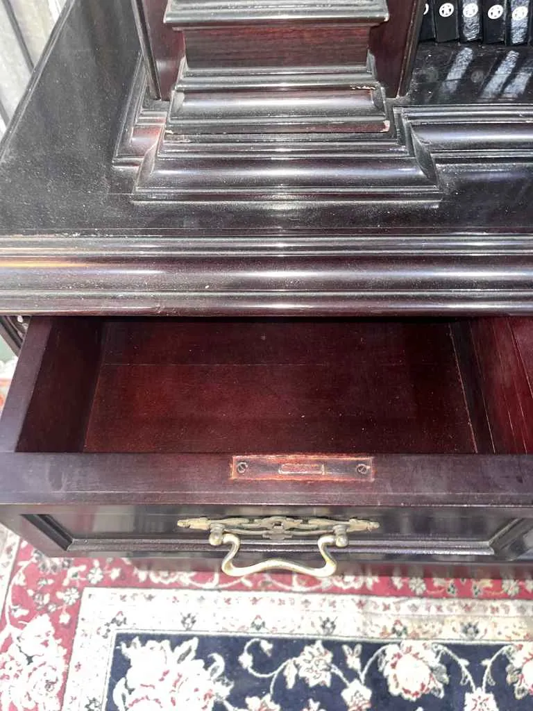 Librería de estilo clásico que ha sido fabricada con madera de buena calidad y robusta. Se trata de una librería que aportará un estilo distintivo al estudio de nuestra casa o a un despacho. Se compone de múltiples baldas, cajones y puertas para almacenar gran cantidad de libros o documentación. Como podemos observar en las fotografías se encuentra en buen estado.