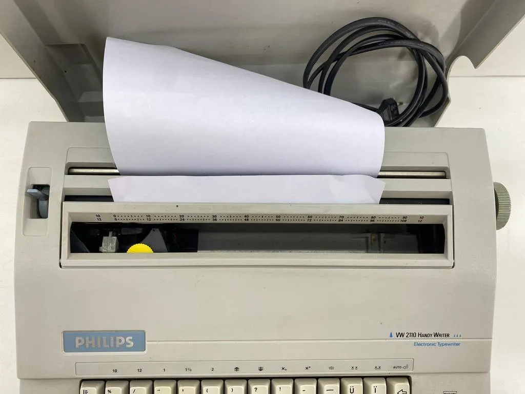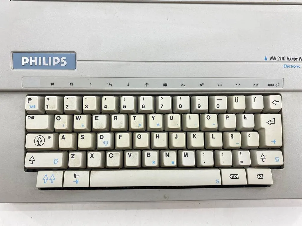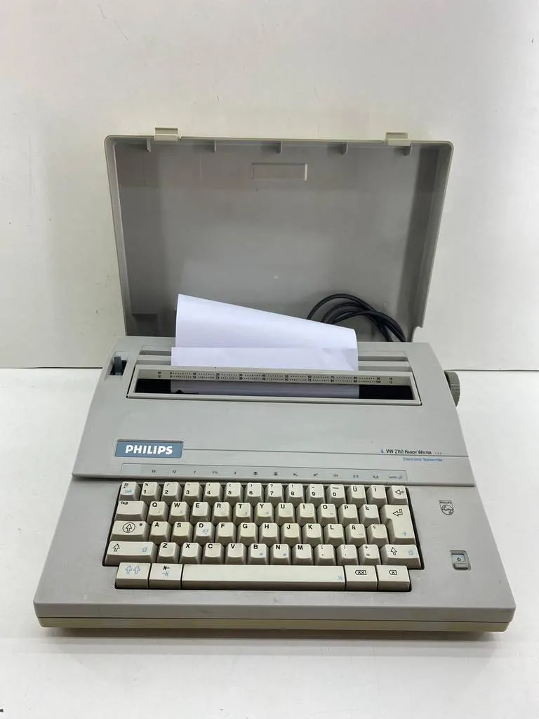 Máquina de escribir eléctrica de la marca Philips VW 2110 Handy Writer. Se trata de una pieza vintage ideal para amantes de este tipo de piezas. Dispone de teclado completo y rueda de colocación de las hojas. Como podemos observar en las fotografías se encuentra en buen estado de conservación.