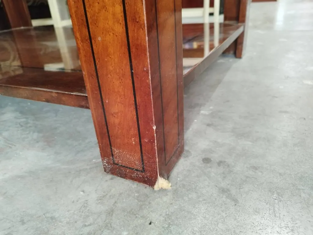 Mesa de centro de grandes dimensiones que ha sido fabricada con madera de buena calidad y robusta. Se trata de una mesa muy elegante con un cristal grueso y transparente en la parte superior y un habitáculo amplio en la inferior ideal para colocar revistas o libros. Es una mesa perfecta para colocar frente al sofá en el salón comedor. Como podemos observar en las fotografías presenta ligeros desperfectos.