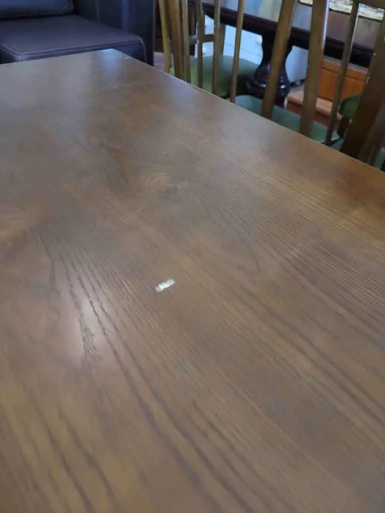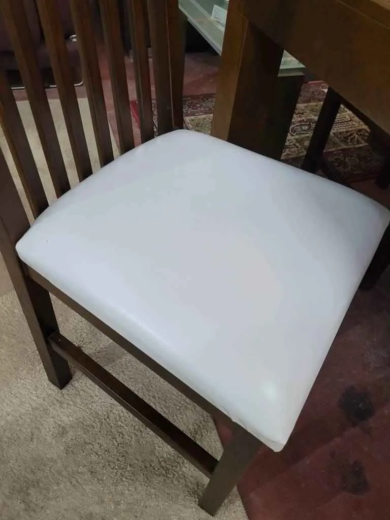 Conjunto formado por una mesa con forma cuadrada y cuatro sillas. Se trata de una mesa y cuatro sillas fabricadas en madera de buena calidad y robusta de color marrón oscuro. La mesa cuenta con cuatro patas robustas y las sillas tienen un asiento tapizado en color blanco. Es un conjunto ideal para amueblar un salón comedor. Como se ve en las imágenes todo se encuentra en buen estado.