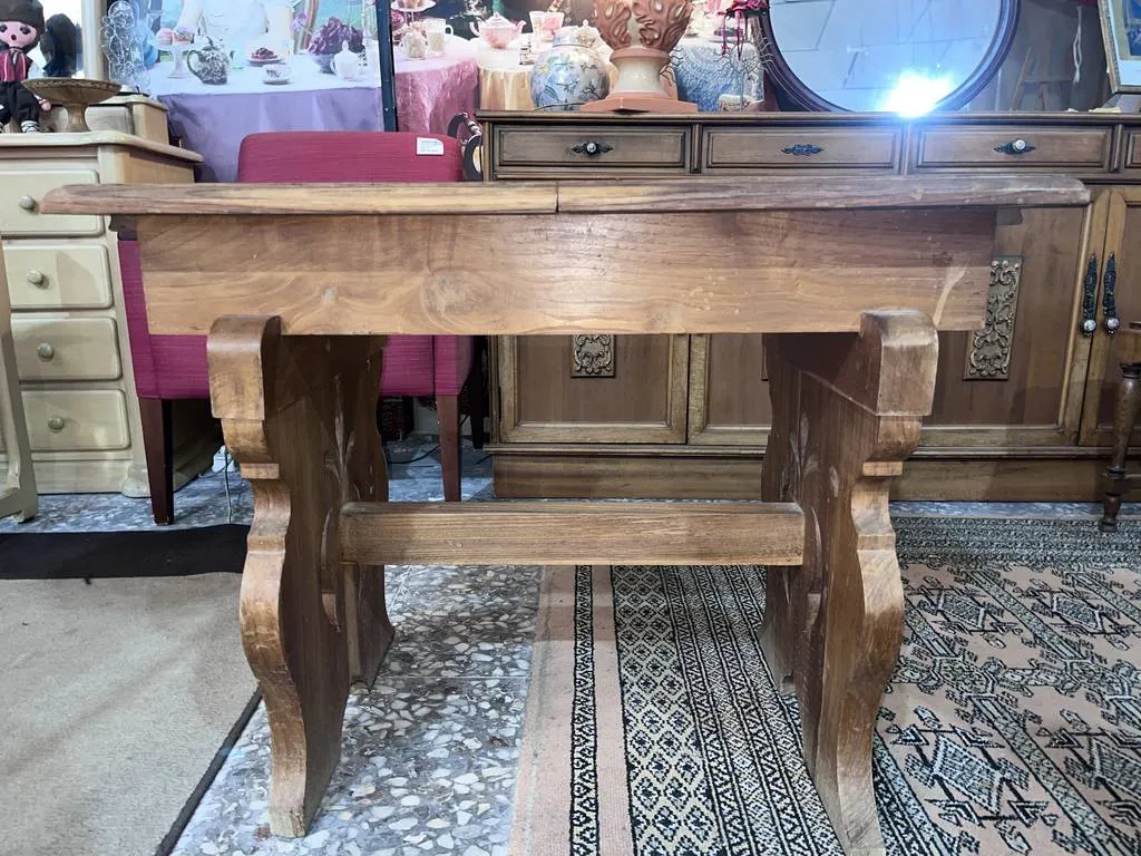 Mesita auxiliar fabricada en madera de buena caildad de color marrón oscuro. Se trata de una mesita de pequeño tamaño que cuenta con dos patas robustas unidas por un listón de madera. La mesita cuenta con un cajón interior y resulta perfecta para ponerla en un salón comedor. Como se puede observar en las fotografías la mesa se encuentra algo deteriorada por el uso por lo que se recomienda restaurar antes de utilizarla.