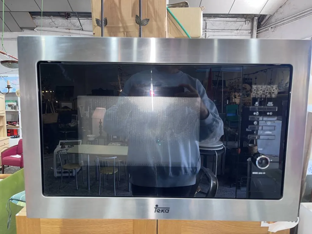 Microondas de la reconocida marca de electrodomésticos Teka de color plateado. Se trata de un práctico microondas encastrado que tiene varias funciones para calentar y cocinar distintos alimentos. Es un electrodoméstico ideal para tenerlo en cualquier cocina. Como se puede observar en las fotografías se encuentra en buen estado y es ideal para tenerlo encastrado en una cocina.