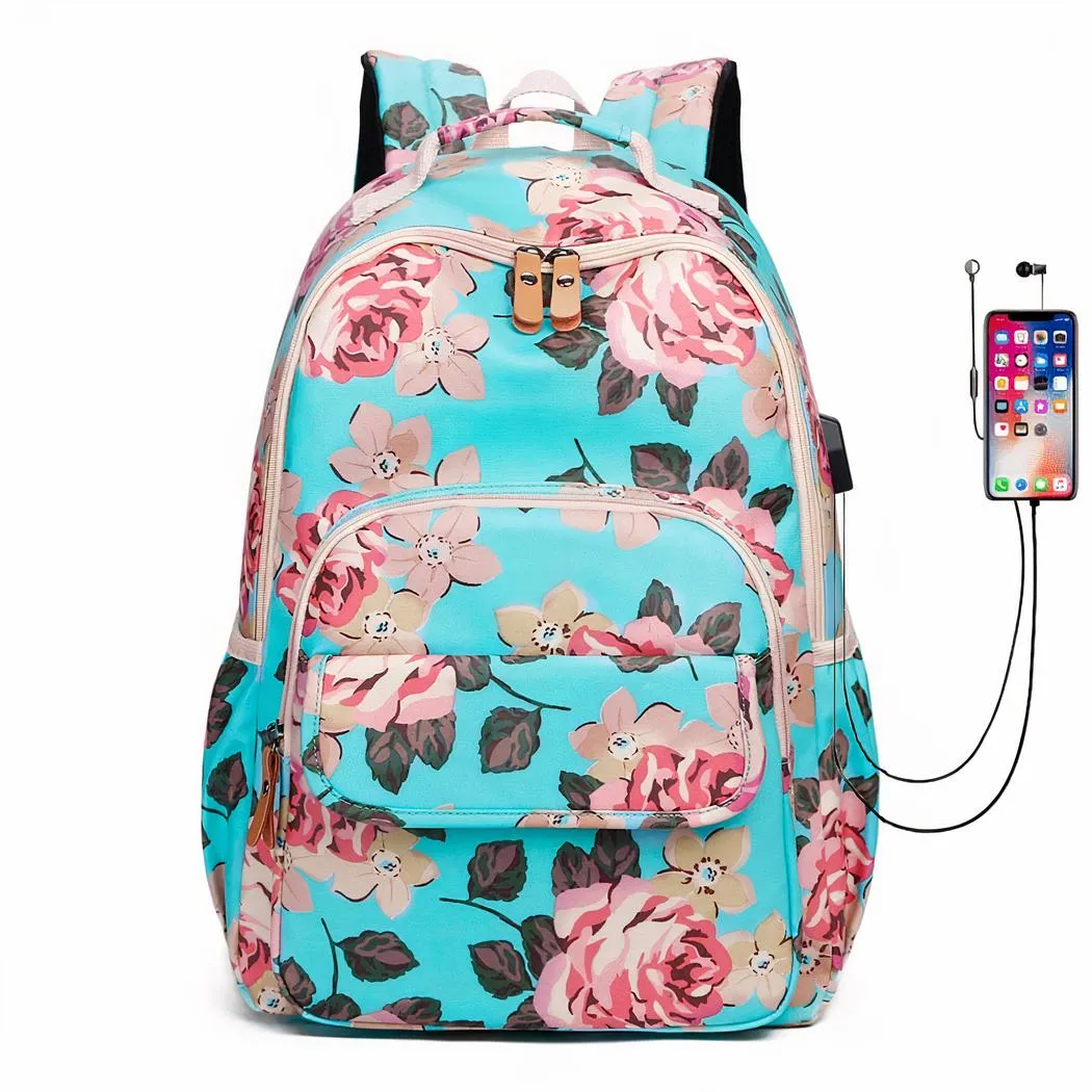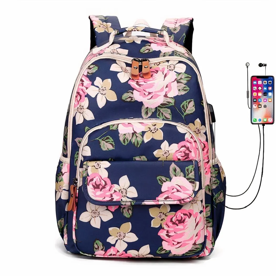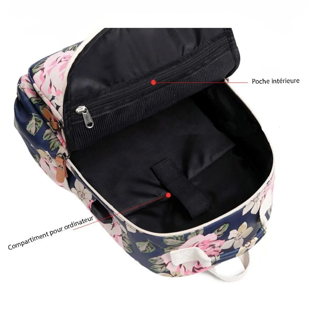 Una original mochila impermeable con estampado floral y compartimento para el portátil. Tiene un bolsillo interior con cremallera y dos bolsillos exteriores para un almacenamiento óptimo. También tiene un puerto USB para que pueda cargar su teléfono colocando la batería externa en su interior.