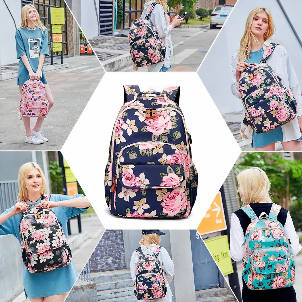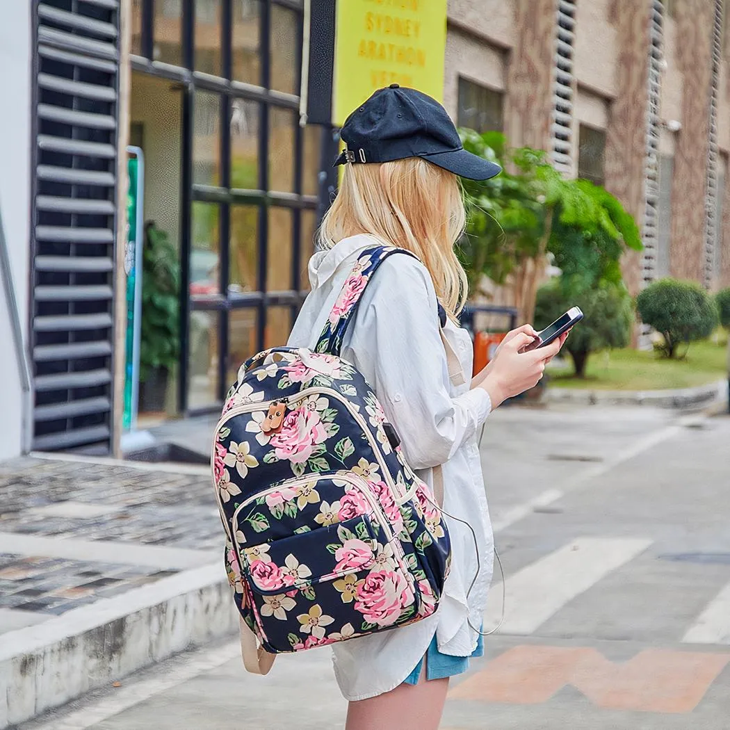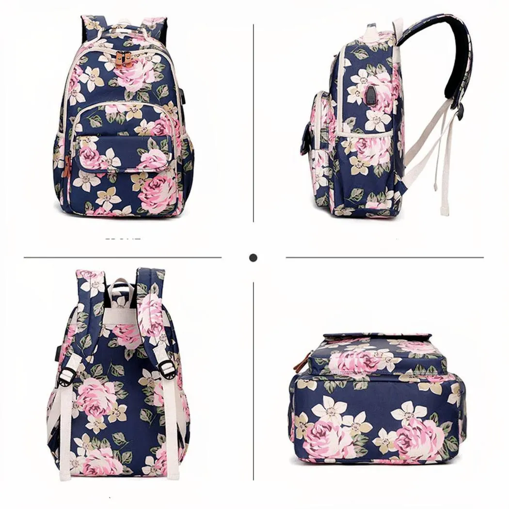 Una original mochila impermeable con estampado floral y compartimento para el portátil. Tiene un bolsillo interior con cremallera y dos bolsillos exteriores para un almacenamiento óptimo. También tiene un puerto USB para que pueda cargar su teléfono colocando la batería externa en su interior.