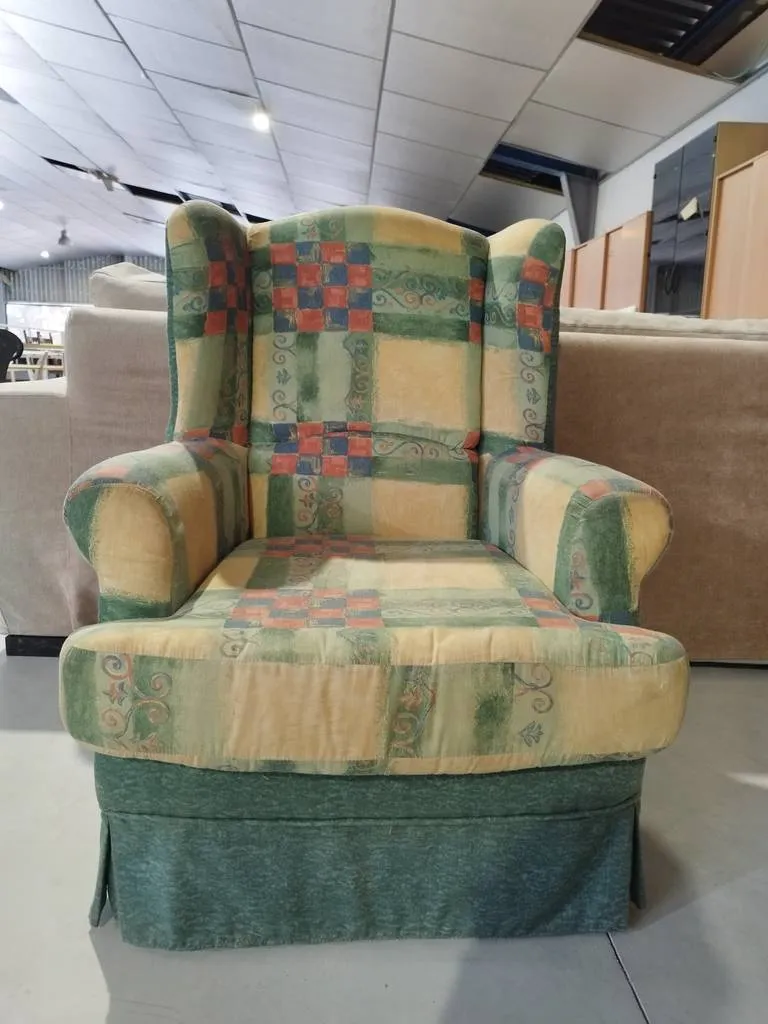 Sillón verde muy bonito con un tapizado a cuadros con múltiples colores. Se trata de un sillón que dispone de un asiento y un respaldo muy cómodo y acolchado, así como también incorpora reposabrazos en los laterales para una mayor relajación. Es ideal para colocar en un salón comedor. Como podemos observar en las fotografías se encuentra en buenas condiciones