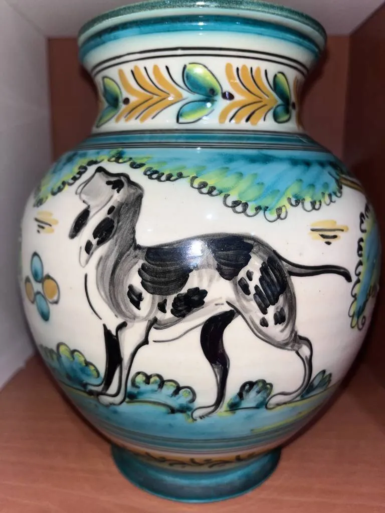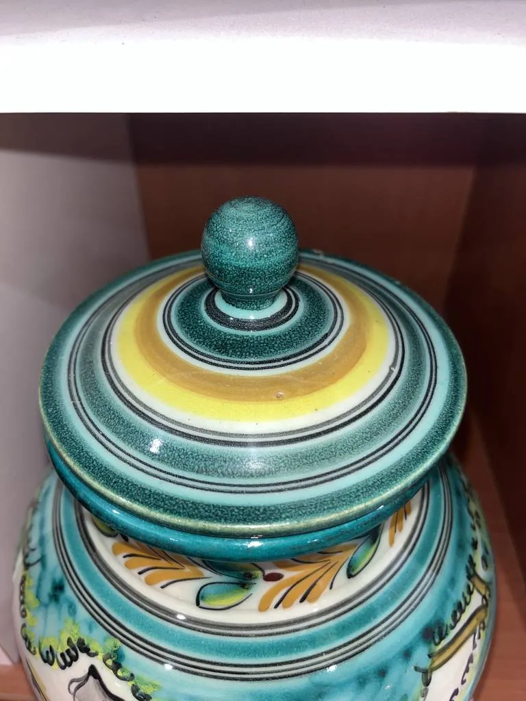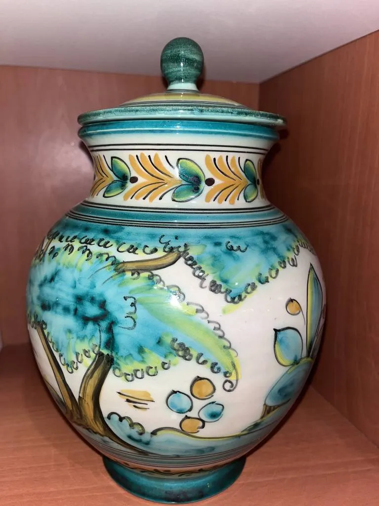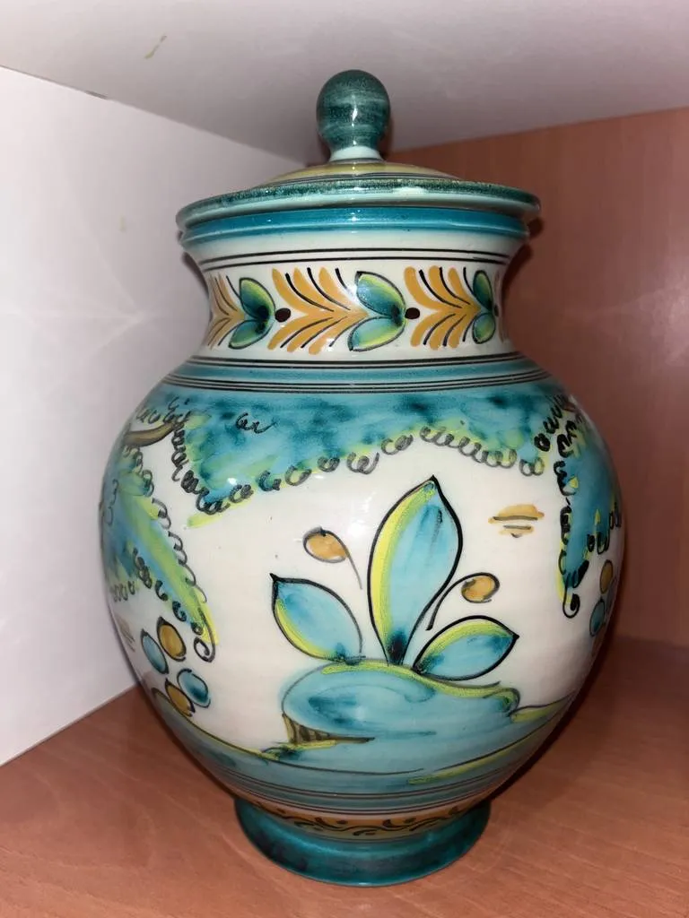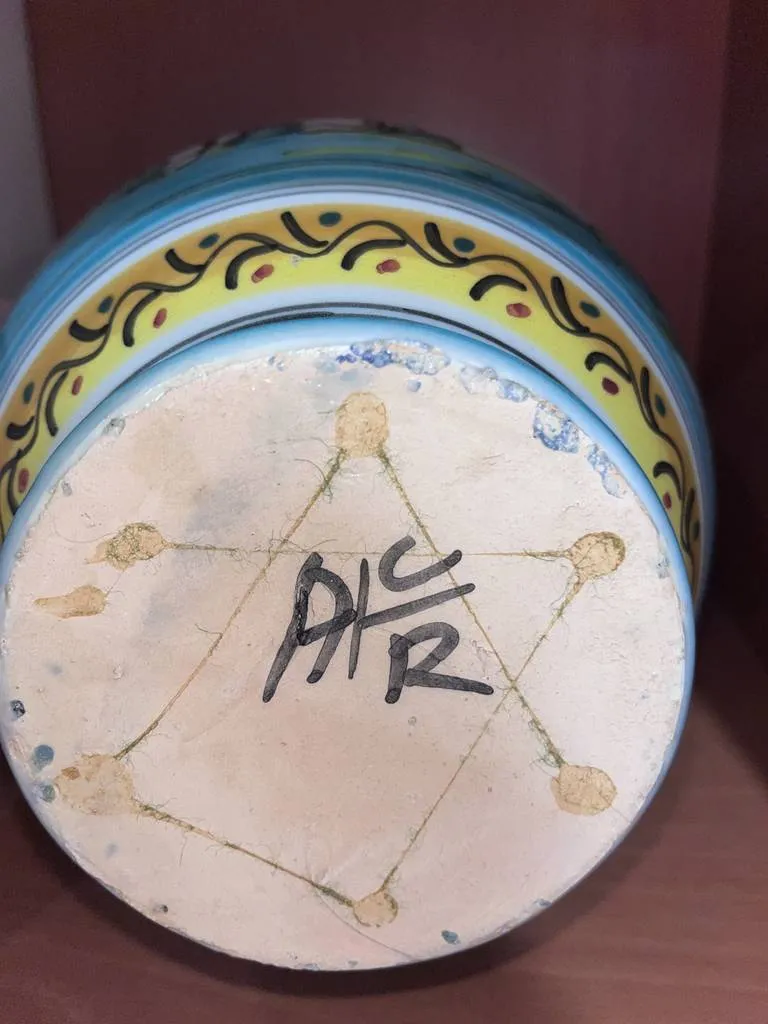 Vasija fabricada en cerámica de buena calidad en Puente del Arzobispo. Se trata de una vasija con tapa que tiene una decoración muy llamativa con dibujos de colores pintados a mano. Es una vasija ideal para ponerla en cualquier estancia del hogar como elemento decorativo. Como se puede observar en las fotografías se encuentra en buenas condiciones.