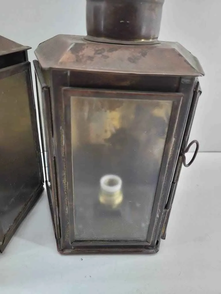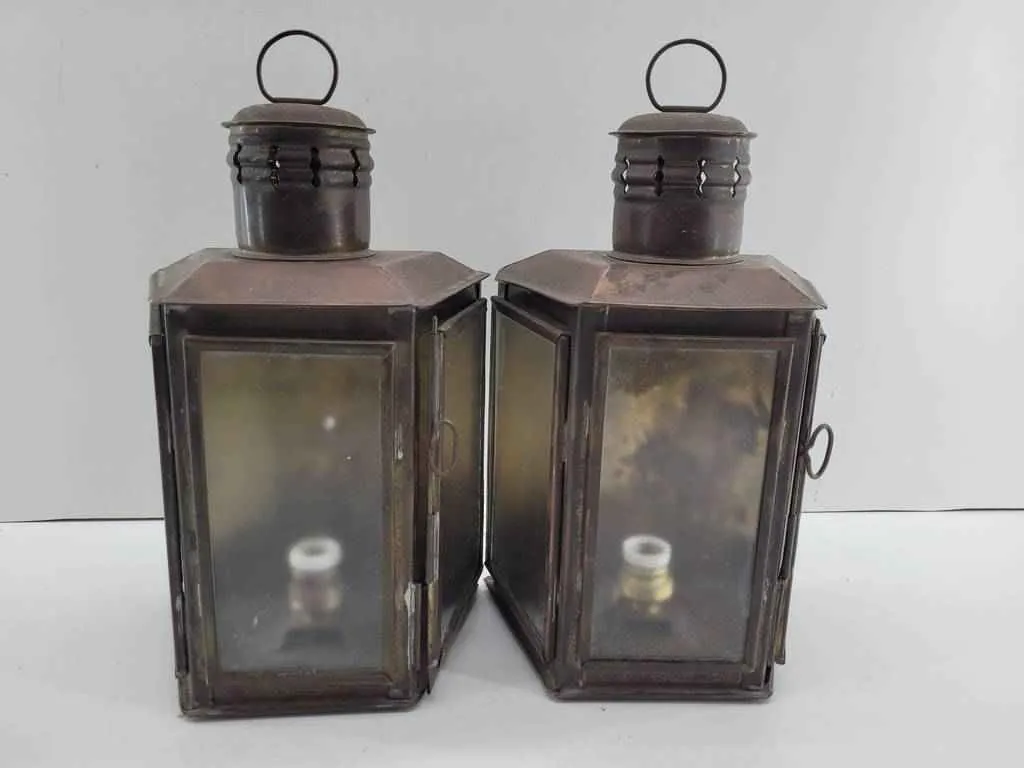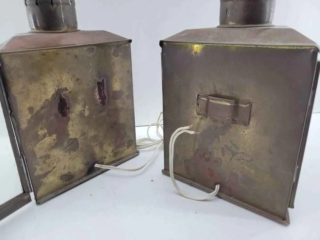 Pareja formada por dos faroles de barco. Se trata de dos faroles de barco que disponen en uno de sus lados de un anclaje para colgarlos en la pared y tienen en la parte superior un asa para cogerlo con mayor comodidad y transportarlos fácilmente de un lado a otro. Como se puede observar en las fotografías se encuentran bien conservados y pueden ser utilizados.