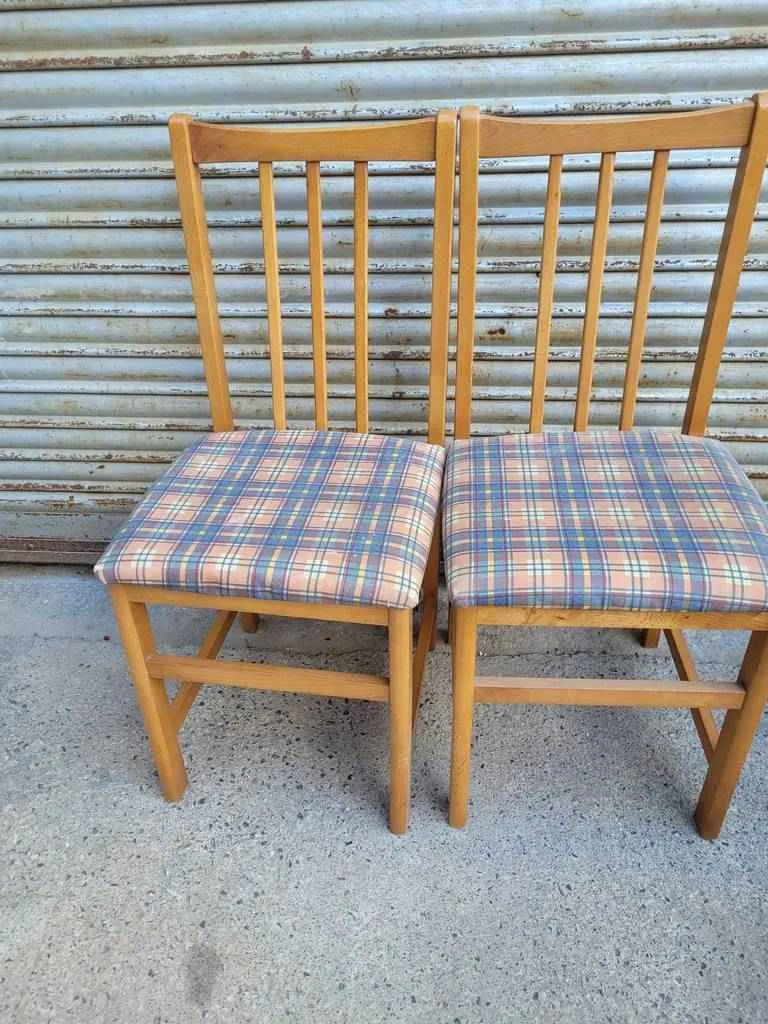 Lote compuesto por dos sillas con una estructura ha sido realizada con madera de buena calidad y robusta. Disponen de un bonito respaldo formado por finos listones de madera y también de un asiento tapizado a cuadros que es muy acolchado y cómodo. Son ideales para colocar en un salón comedor o cocina. Como podemos observar en las fotografías presentan ligeros rasguños.