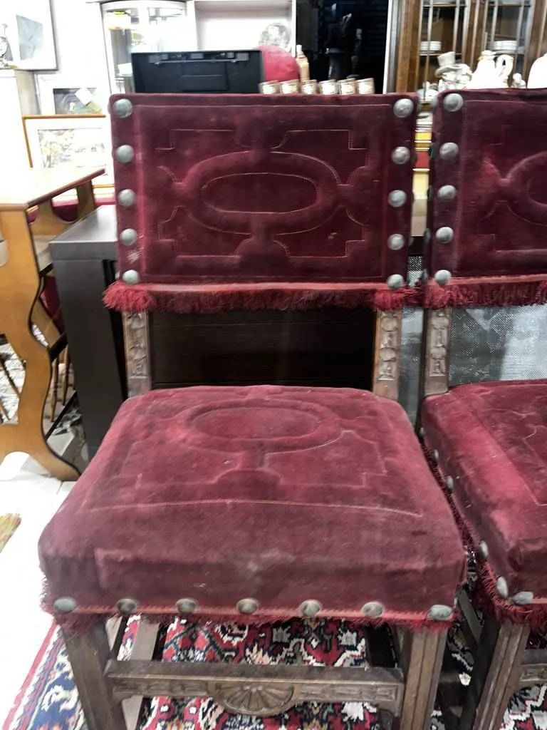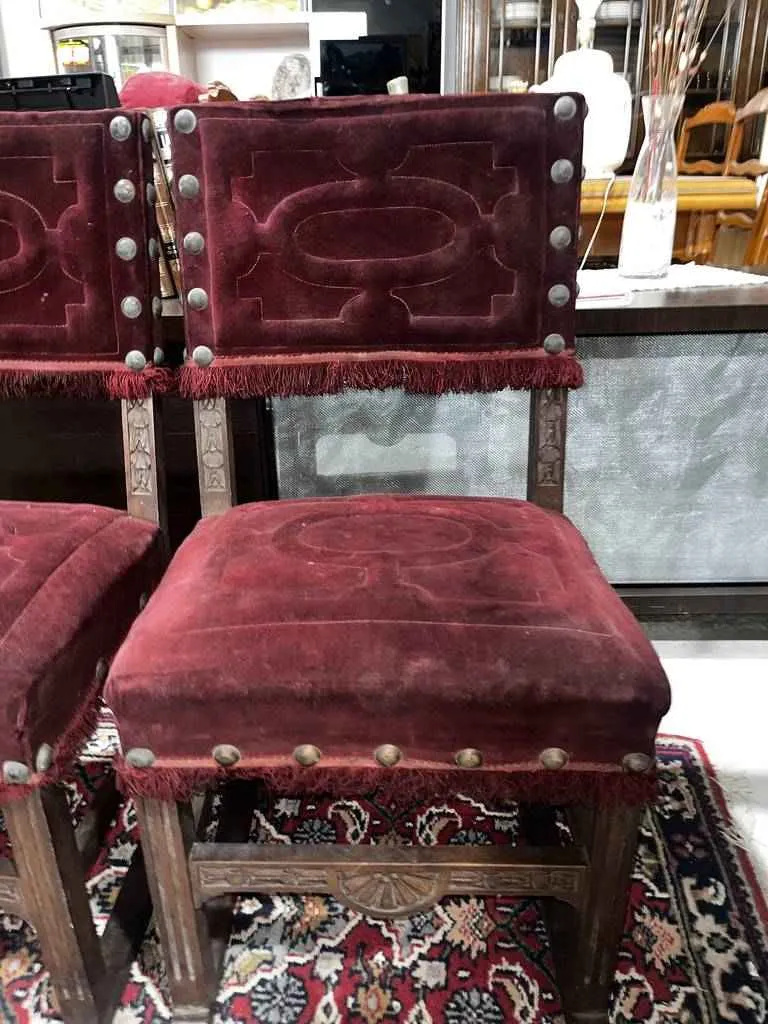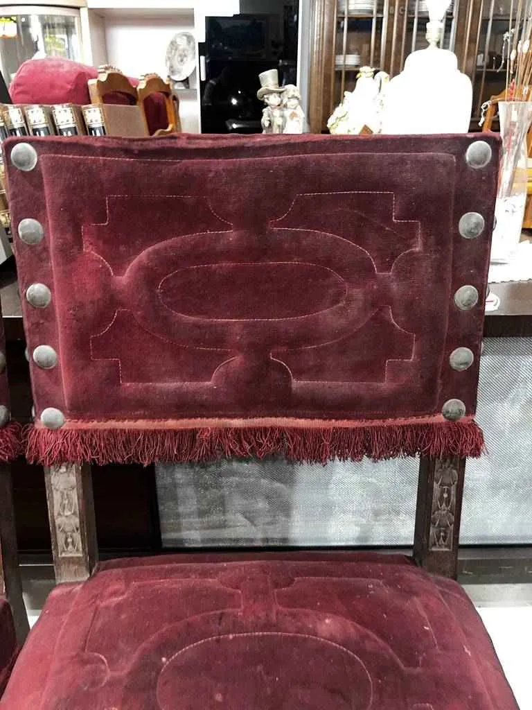 Dos sillas de estilo clásico y elegante que han sido fabricadas con madera de buena calidad y robusta. Estas sillas harán resaltar nuestro salón comedor con ese bonito tapizado en color burdeos que además es muy acolchado y de tela suave y agradable al tacto. Dispone de bonitos detalles tallados en madera muy bonitos. Como podemos observar en las fotografías presentan un poco de desgaste.