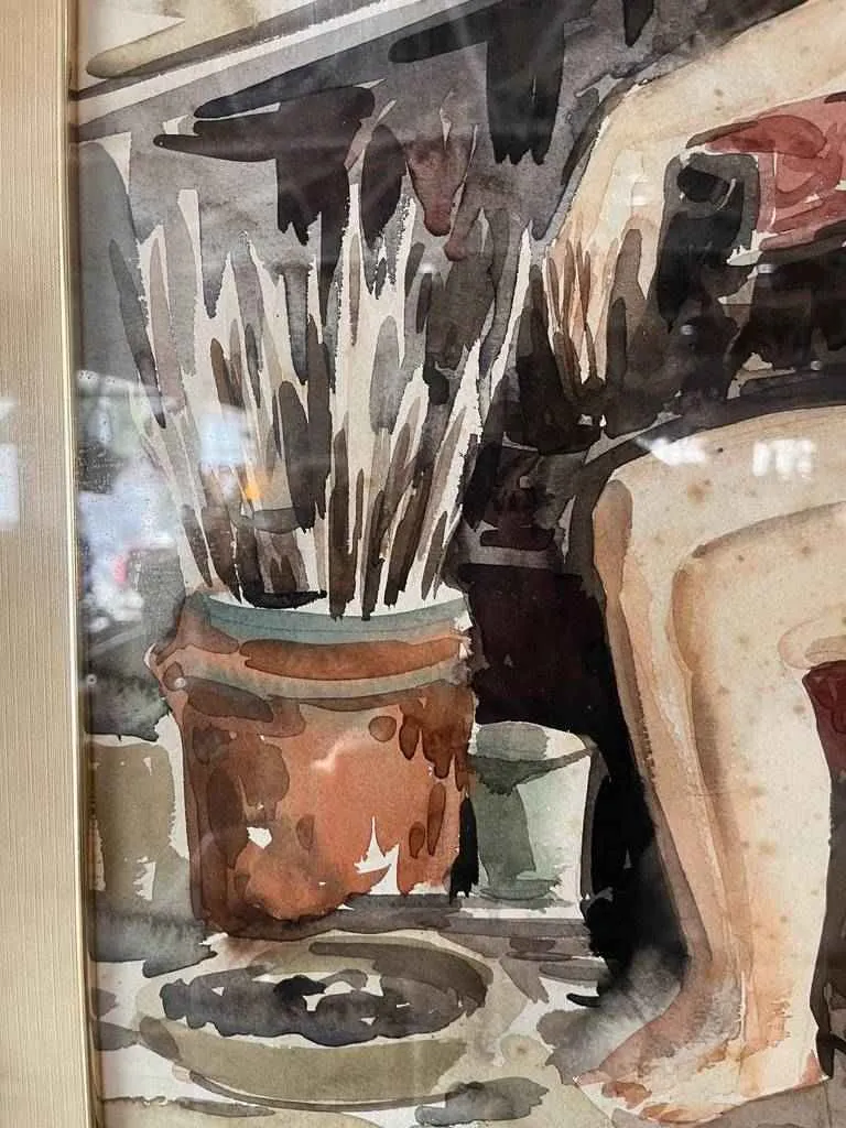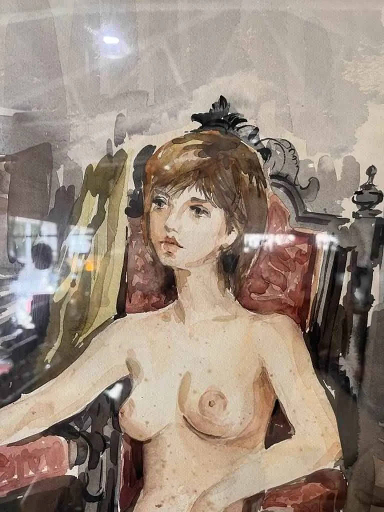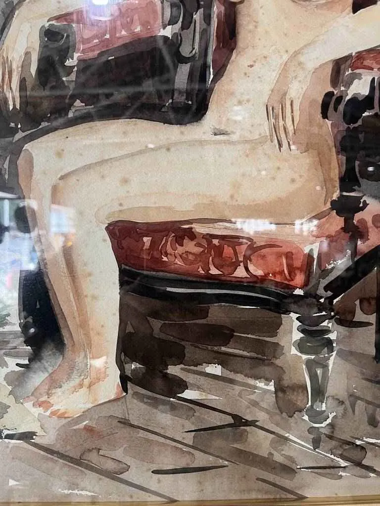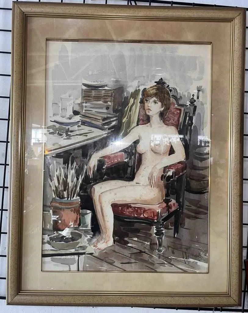 Cuadro realizado en acuarela y firmado por su autor “Ruiz Morante”. En la pintura podemos observar a una mujer desnuda sentada sobre un sillón muy elegante y está en lo que parece ser un estudio de pintura. Es un cuadro ideal para colocar en cualquier estancia de nuestra casa en especial un pasillo o un estudio. Como podemos observar en las fotografías se encuentra en buenas condiciones.