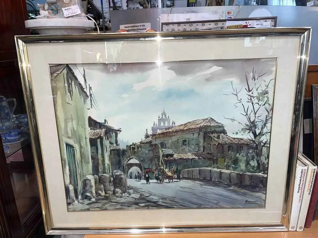 Bonito cuadro pintado a acuarela por el artista Julio Visconti Merino. En la pintura, se puede apreciar un antiguo poblado con gente andando por la calle, y también a un caballo tirando de un carruaje. Se pueden también apreciar casas antiguas, pintadas con una gran calidad y precisión. La pintura se encuentra sobre fondo blanco, con un bonito marco dorado que la hace destacar. Es una auténtica obra de arte, ideal para colocar en esa pared de casa que tienes vacía.