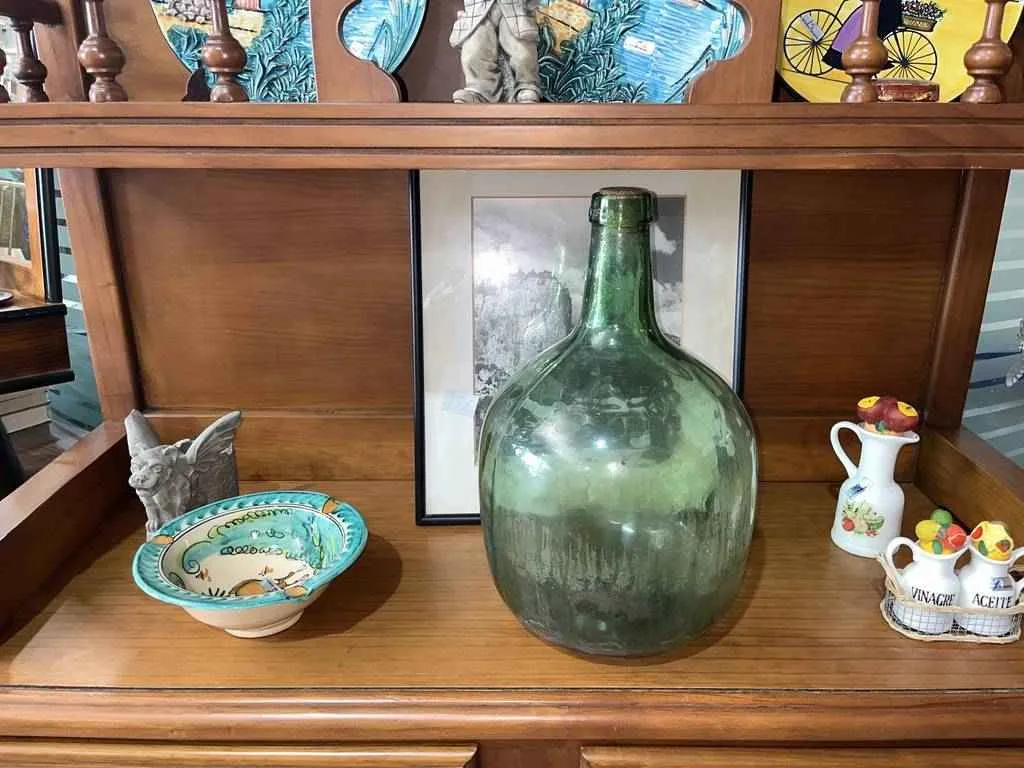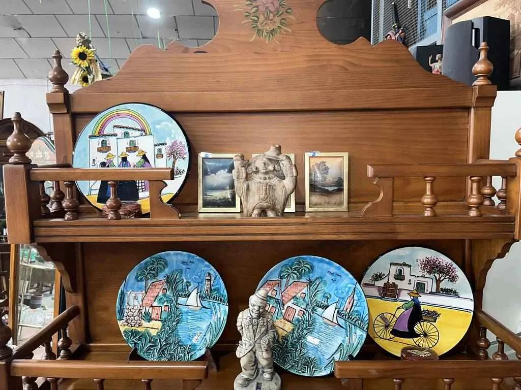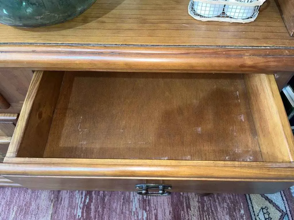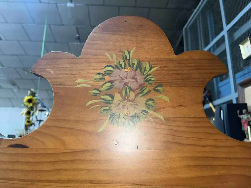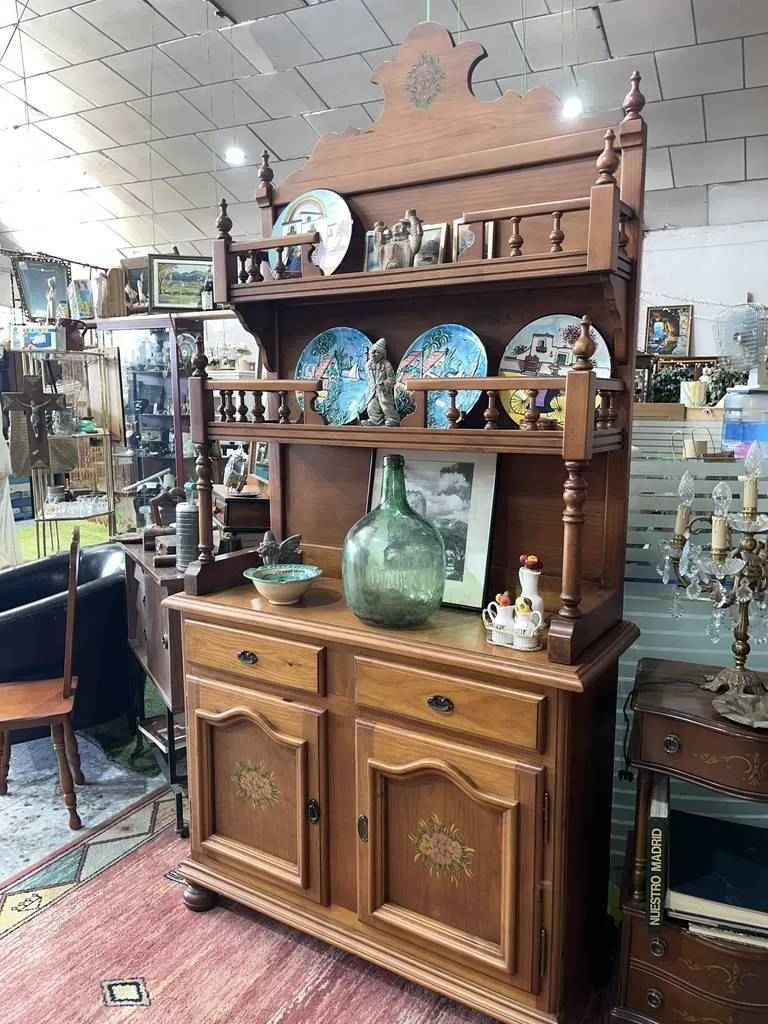 Alacena de estilo rústico, hecha de madera de buena calidad y robusta. Dispone de un bonito estante en la parte superior, con finas columnas de madera tallada, que le dan un toque muy llamativo. En la parte baja tiene dos armarios con puerta y dos pequeños cajones alargados. Tanto los cajones como las puertas tienen tiradores metálicos que facilitan su apertura. Las puertas también tienen dibujitos de estilo floral en la parte frontal. A una de las puertas le falta el tirador.
