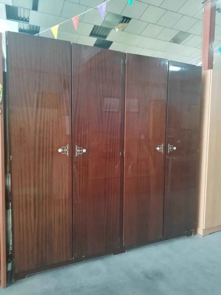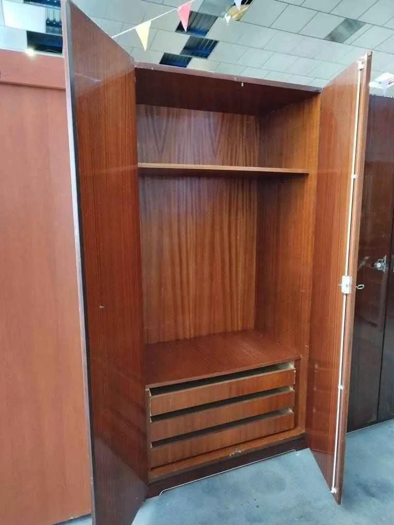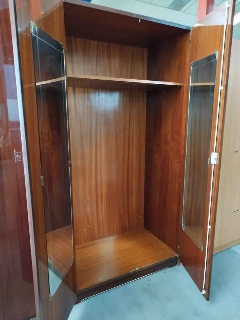 Armario grande de estilo clásico fabricado en madera de buena calidad. Estructura robusta y duradera. Se compone de cuatro puertas, separadas en dos. En el interior contiene un espejo en cada lado. Con grandes tiradores metálicos que facilitan su apertura. Con gran capacidad de almacenaje.