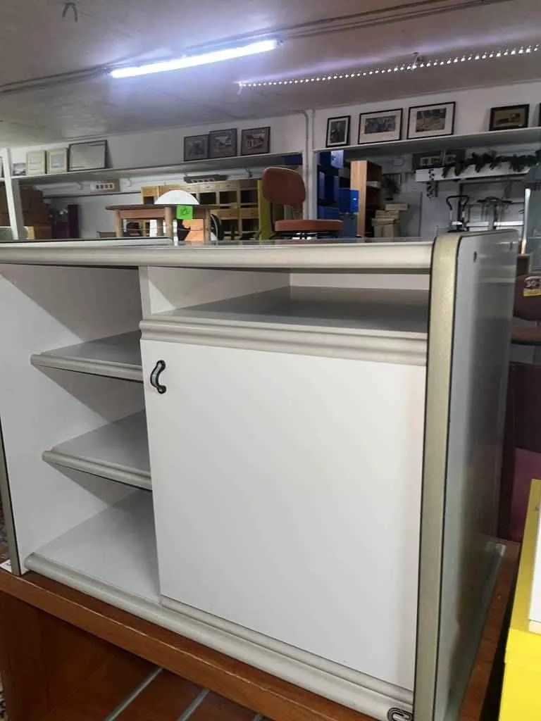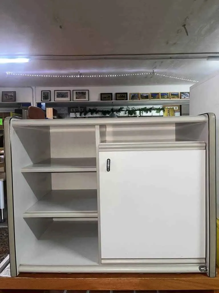 Armario de oficina de pequeño tamaño de color blanco. Se trata de un armario de oficina bajo que dispone de una puerta en un lateral con un pequeño tirador en forma de asa y en el otro lado tiene dos baldas para colocar documentos u objetos. Es un mueble ideal para ponerlo en una oficina o en el despacho del hogar. Como se puede observar en las fotografías se encuentra en buenas condiciones.