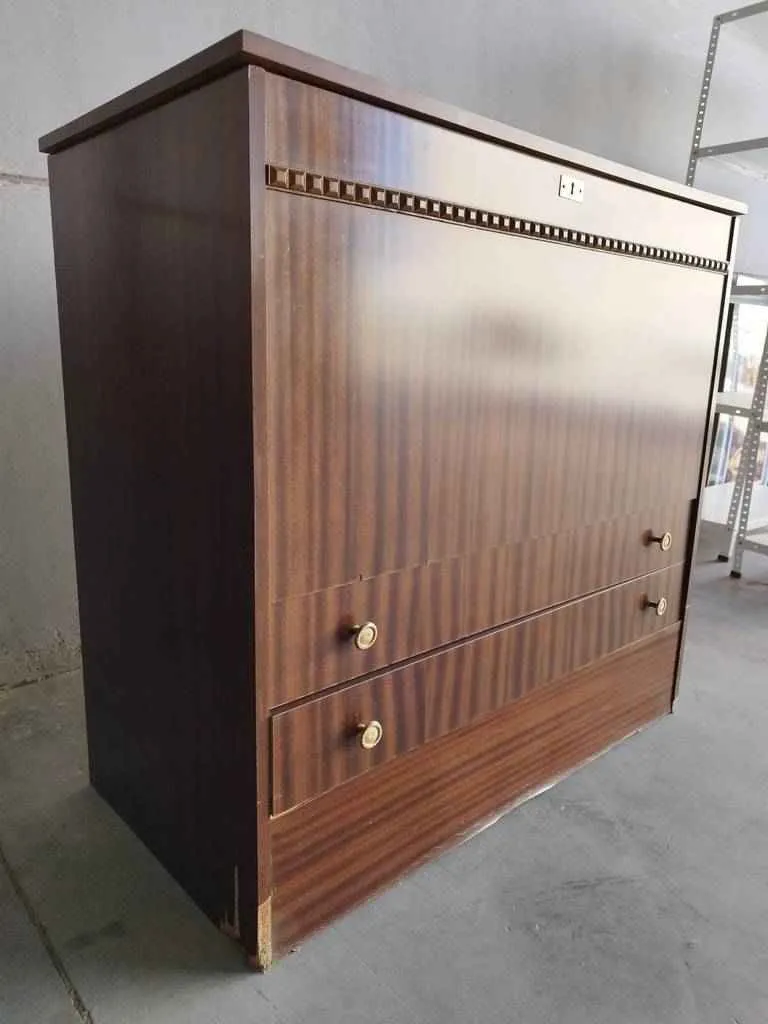 Baúl de estilo clásico que ha sido fabricado con madera de buena calidad y robusta. Dispone en la parte superior de una puerta abatible que en su interior dispone de una bandeja cruzada y de gran espacio de almacenamiento. En la parte inferior dispone de dos cajones con tiradores incorporados para facilitar su apertura. Como podemos observar en las fotografías presenta algunos pequeños desperfectos.