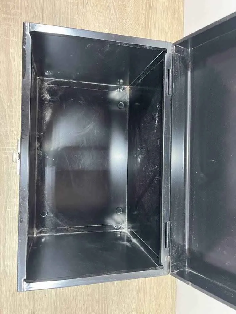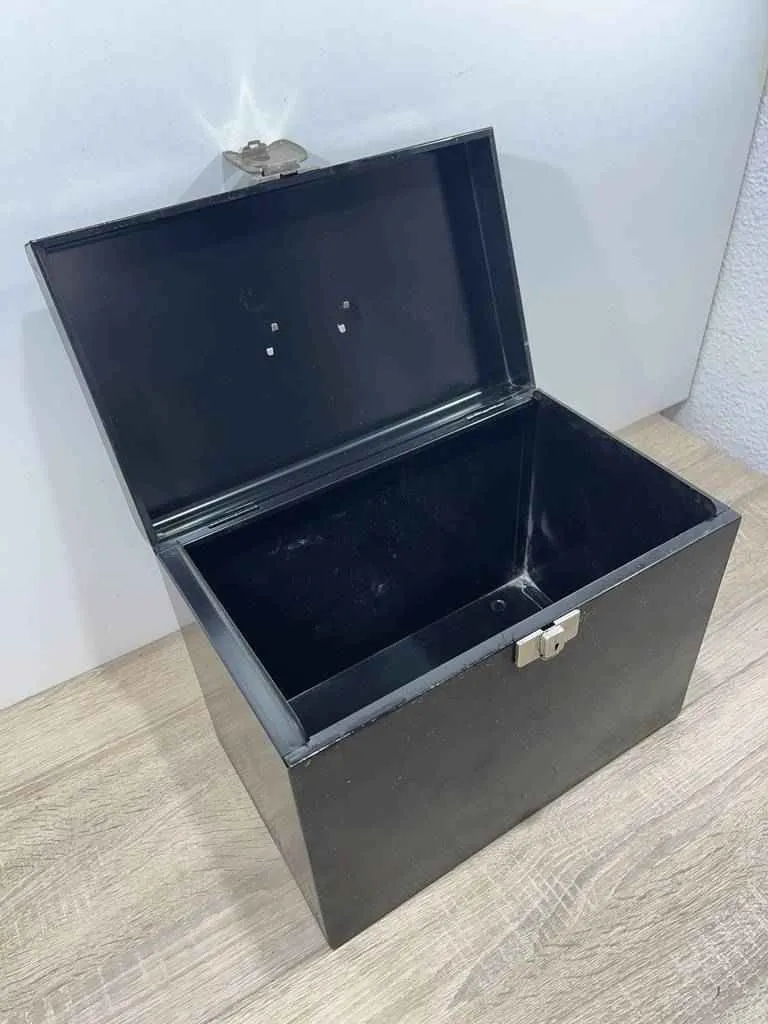 Caja metálica transportable. En color negro esta caja es ideal para transportar enseres con seguridad. En la parte superior dispone de asa para transportar con gran facilidad. Como podemos observar en las fotografías presenta algunos desperfectos, aunque en general se encuentra en buen estado.