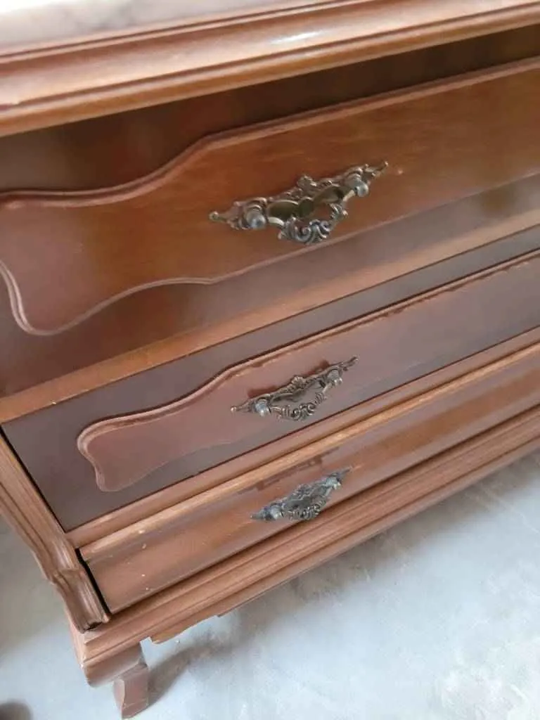 cómoda de estilo clásico que ha sido realizada con madera de buena calidad y robusta. Se compone de un mármol en la parte superior grueso y durable. En la parte frontal tiene tres amplios cajones con dobles tiradores para abrirlos fácilmente. Es ideal para colocar en un dormitorio o vestidor. Como podemos observar en las fotografías presenta desperfectos.