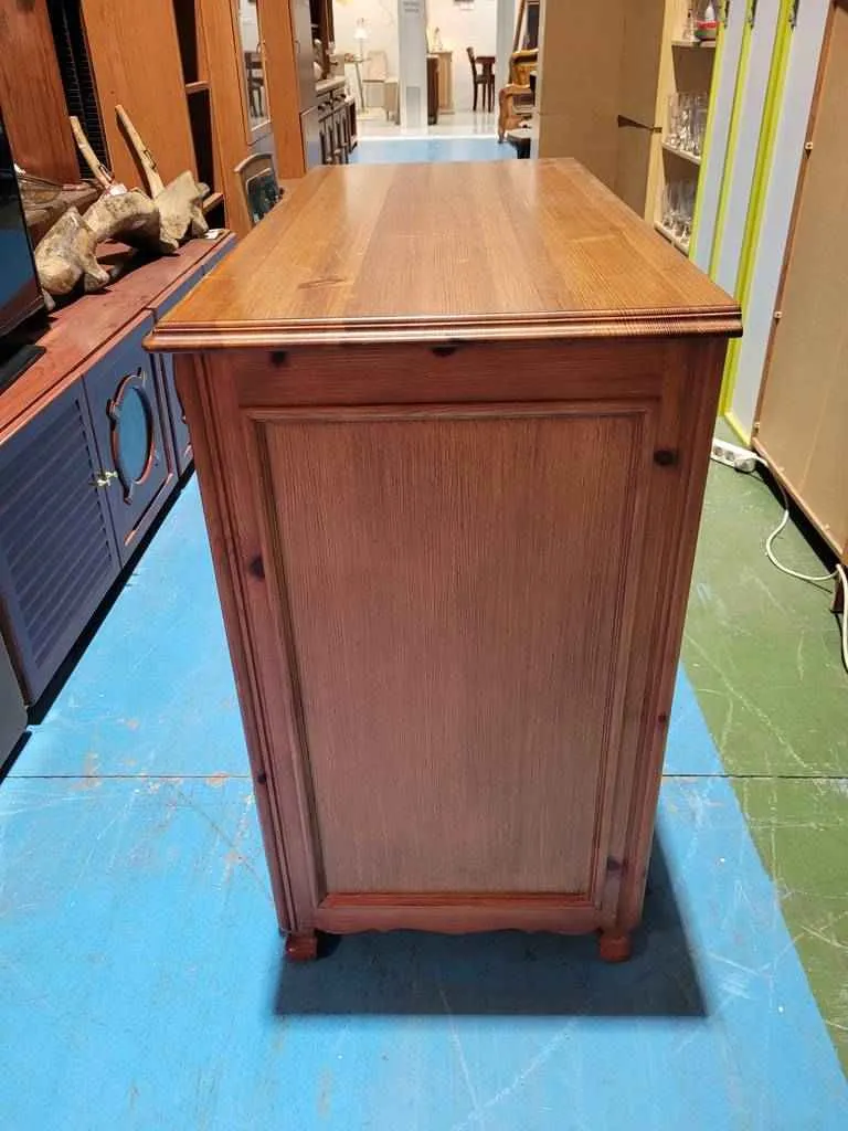 Cómoda muy bonita y elegante que ha sido realizada con madera de buena calidad y robusta. Dispone en la parte frontal de cuatro amplios cajones que incorporan cada uno de ellos dobles tiradores para abrirlos fácilmente. Es una cómoda ideal para colocar en un dormitorio o vestidor. Como podemos observar en las fotografías presenta rasguños.