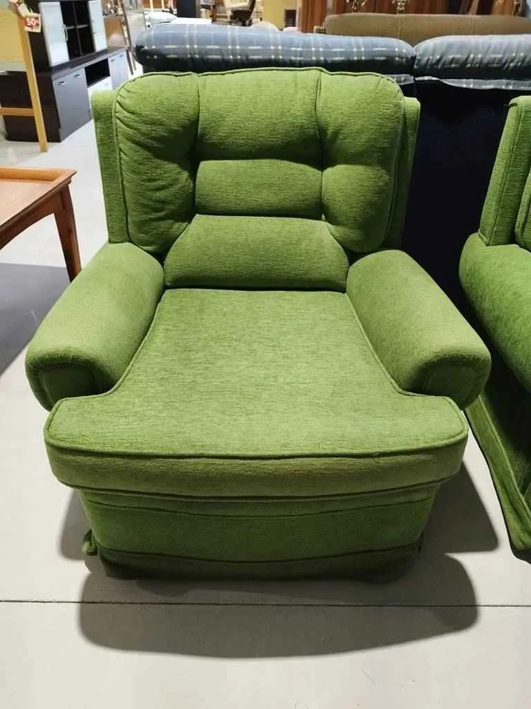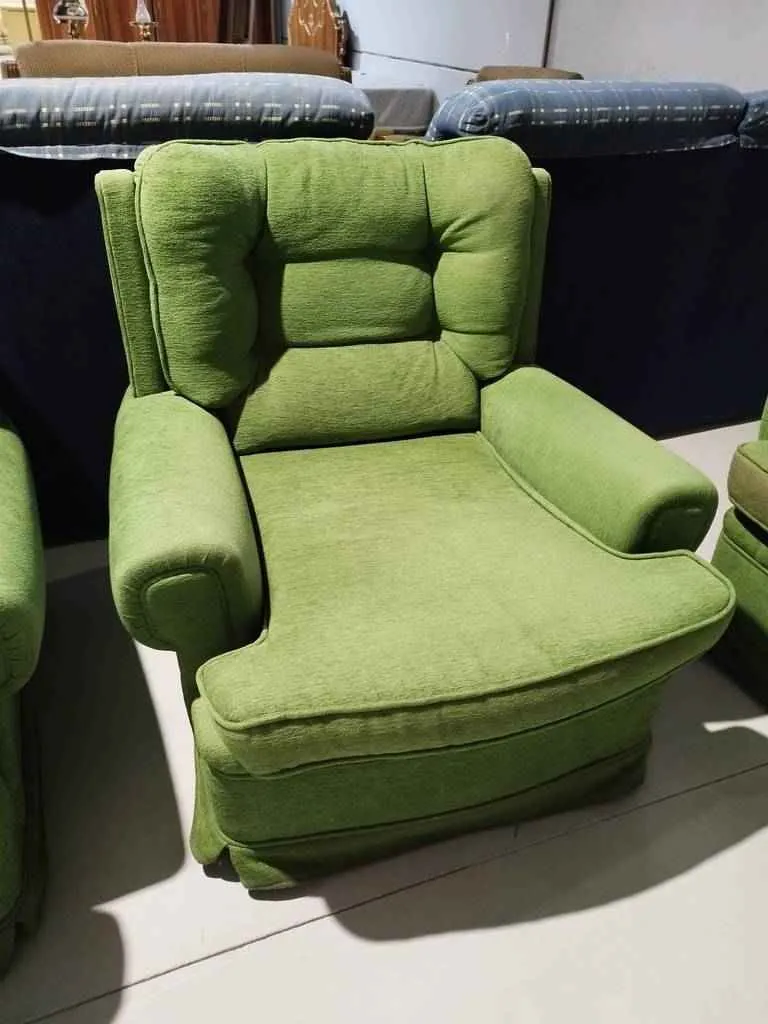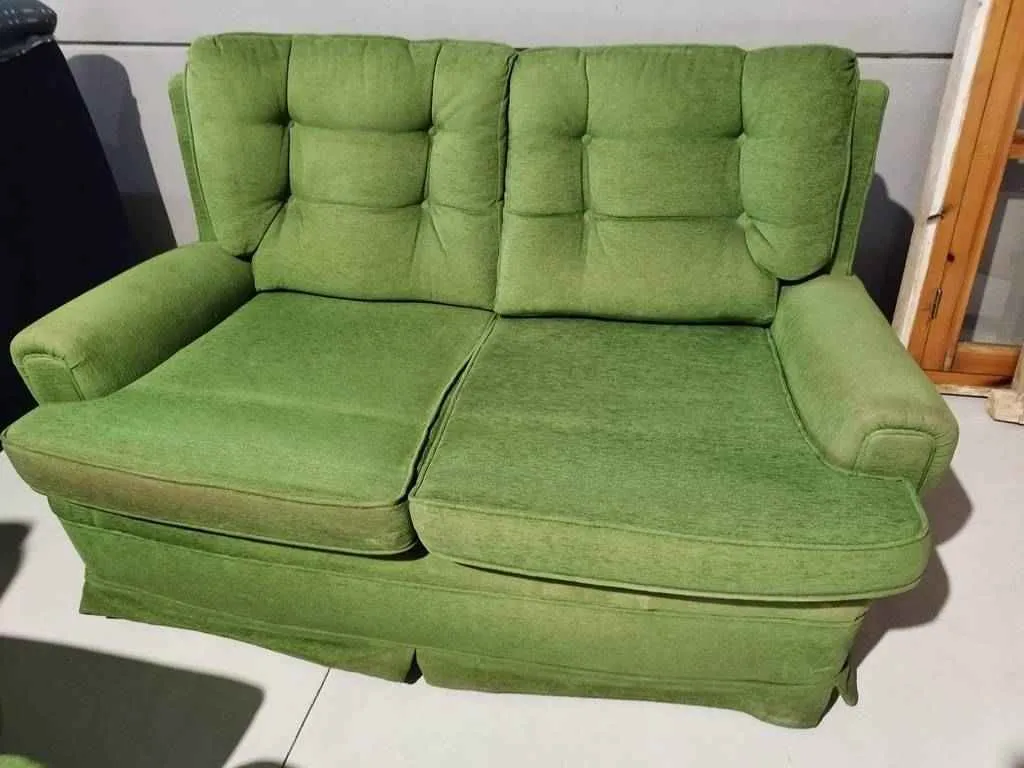 Conjunto compuesto por un sofá de dos plazas y dos sillones en color verde. Disponen de asientos y respaldos acolchados y de tela suave y agradable al tacto. También disponen de reposabrazos que los hacen muy cómodos. Como podemos observar en las fotografías un cojín y un reposabrazos del sofá está manchado, pero el conjunto en general se encuentra en buenas condiciones.