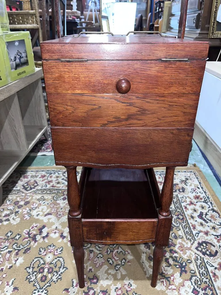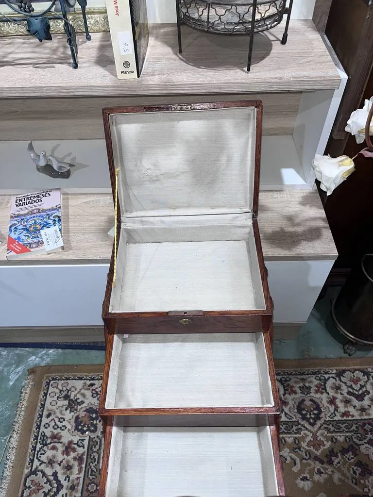 Costurero fabricado en madera de buena calidad y robusta de color marrón oscuro. Se trata de un costurero de tamaño mediano que dispone de un asa en la parte superior y tiene una leja en la parte inferior. Es un costurero que se abre en acordeón y en su interior alberga varios espacios para guardar los diferentes enseres de la costura. Como se puede ver en las fotografías se encuentra en buen estado.