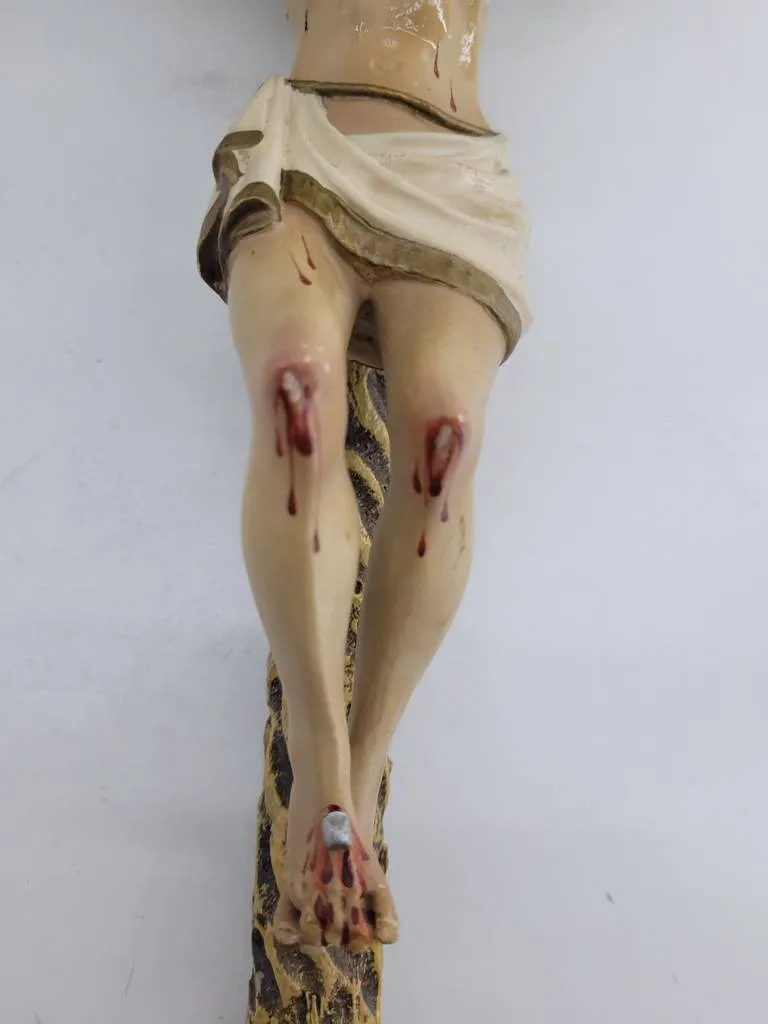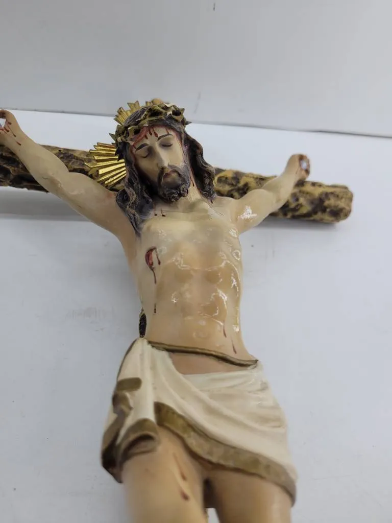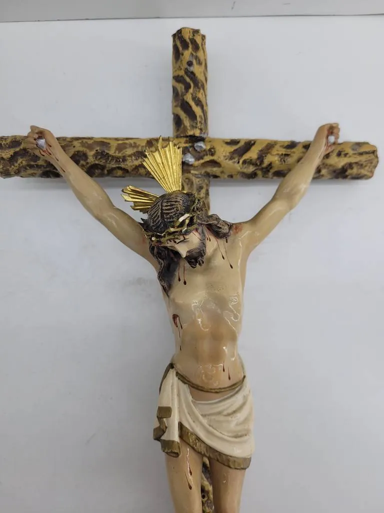 Crucifijo de madera con una figura de Cristo crucificado. Se trata de una cruz de madera de buena calidad que lleva la figura en cerámica de un Cristo semidesnudo crucificado en ella. Es una pieza ideal para coleccionistas o para personas religiosas que quieran exponerla en su hogar. Como se puede observar en las fotografías se encuentra en buenas condiciones aunque tiene un ligero desperfecto en un brazo.