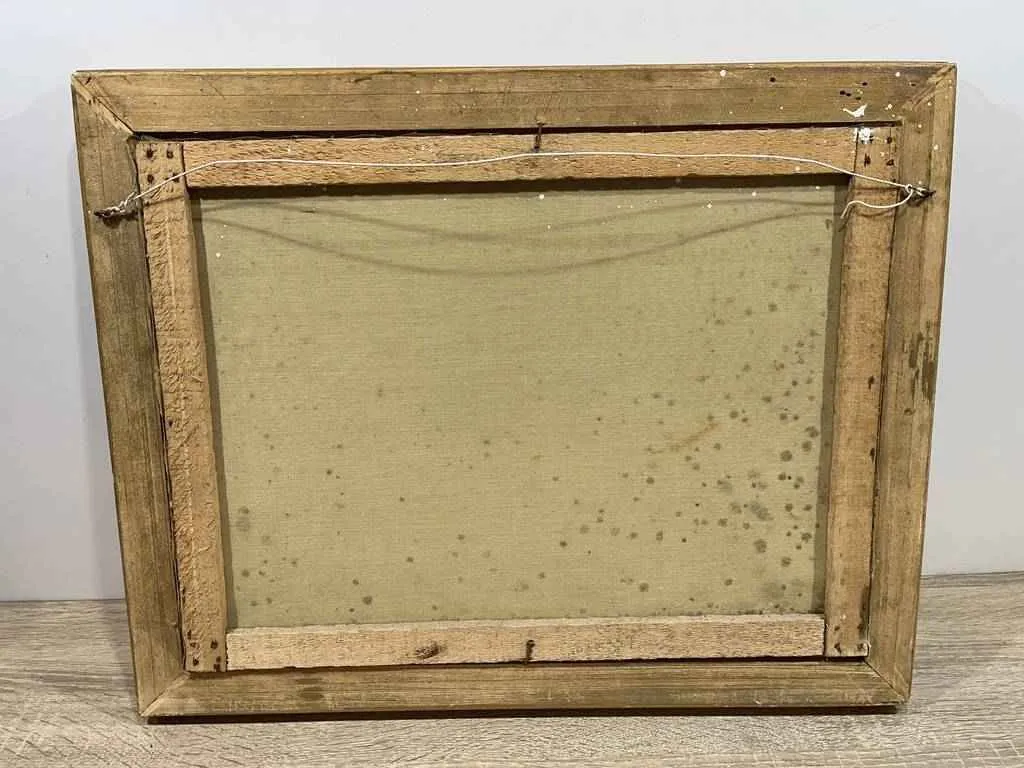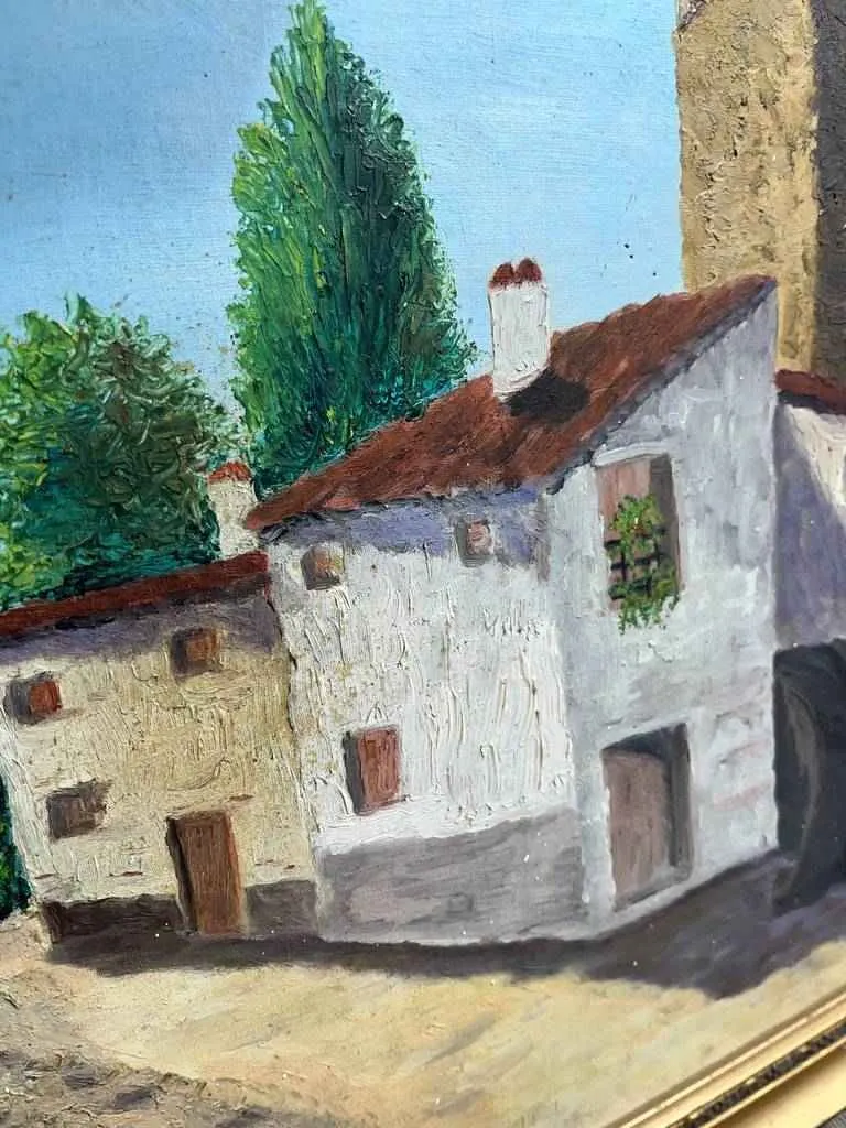 Cuadro elegante pintado al óleo y firmado por su autor E.Simon. Se trata de un cuadro muy bonito y original en el que podemos observar pueblo de época con unos árboles al fondo. Está rodeado por un elegante marco con detalles dorados. Es ideal para un recibidor o para un salón comedor. Como podemos observar en las fotografías el marco presenta algunos desperfectos pero la pintura se encuentra en buenas condiciones.