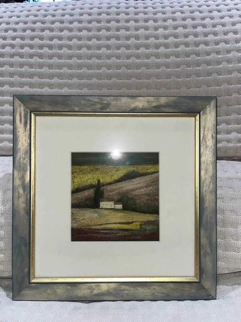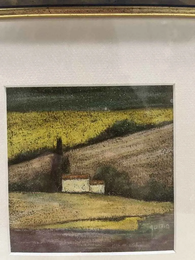 Cuadro pintado al óleo por el pintor Jesús García Noguera. Se trata de una bonita pintura hecha con una gran calidad y detalle, en la que se puede apreciar una casa de campo rodeada de una intensa vegetación. La pintura se encuentra sobre fondo blanco y enmarcada en un bonito cuadro con el borde dorado que lo hace resaltar. Es una auténtica obra de arte ideal para darle un toque original al hogar.