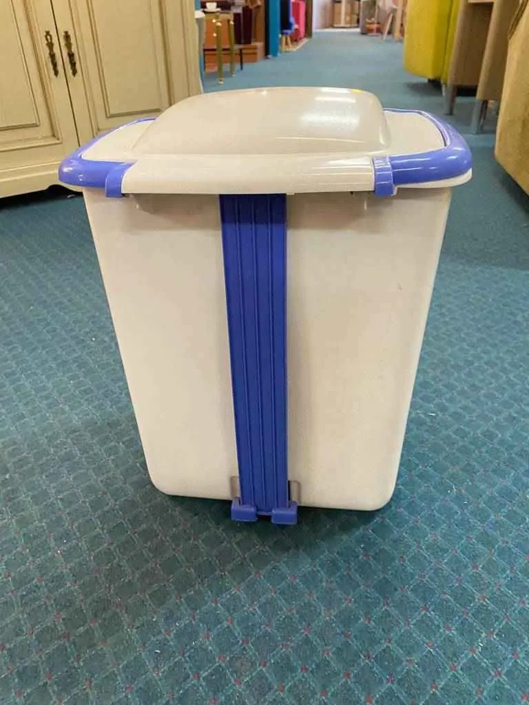 Cubo de reciclaje en color blanco y con detalles en azul. Se trata de un cubo fabricado con plástico duro de buena calidad. Incorpora un pedal en la parte inferior para abrirlo y cerrarlo cómodamente. Es perfecto para colocarlo en una cocina. Como podemos observar en las fotografías se encuentra en buenas condiciones.