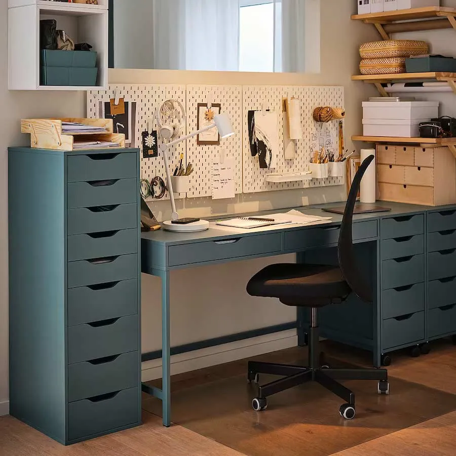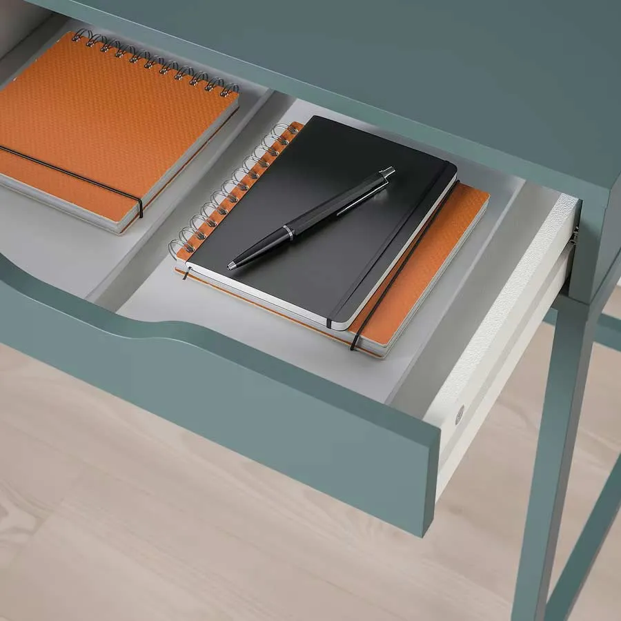 Escritorio compacto con dos cajones y sistema para ocultar los cables.