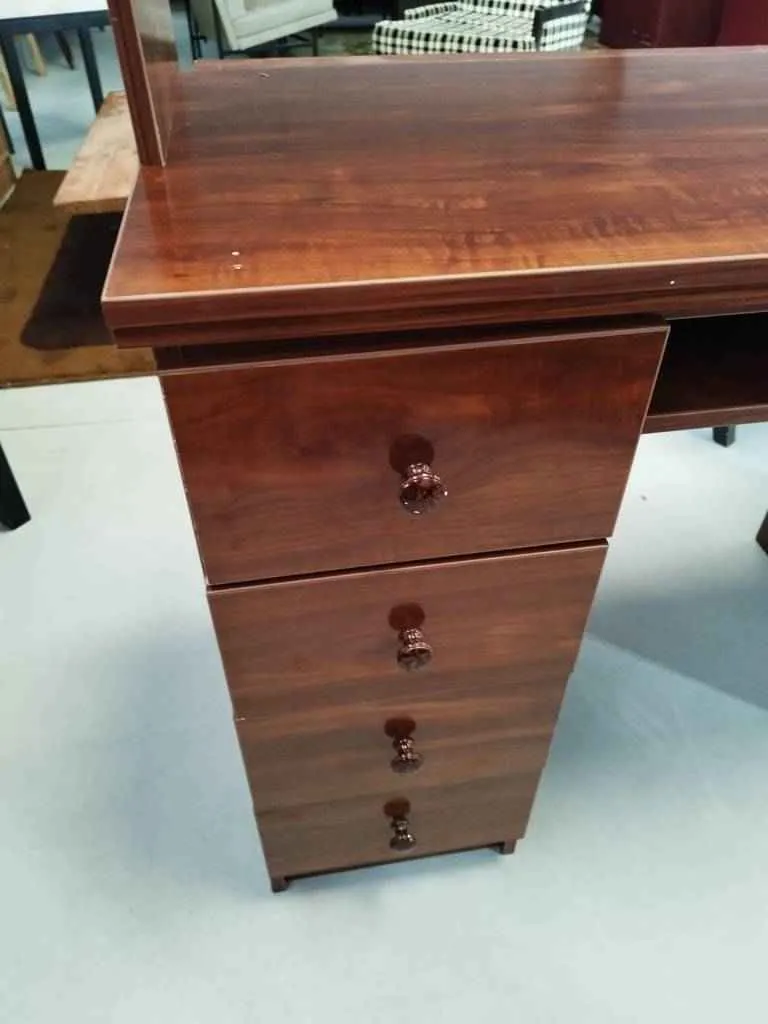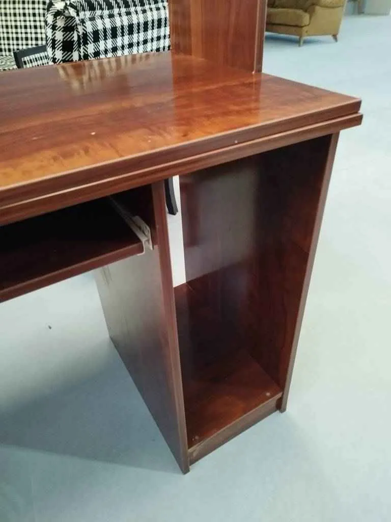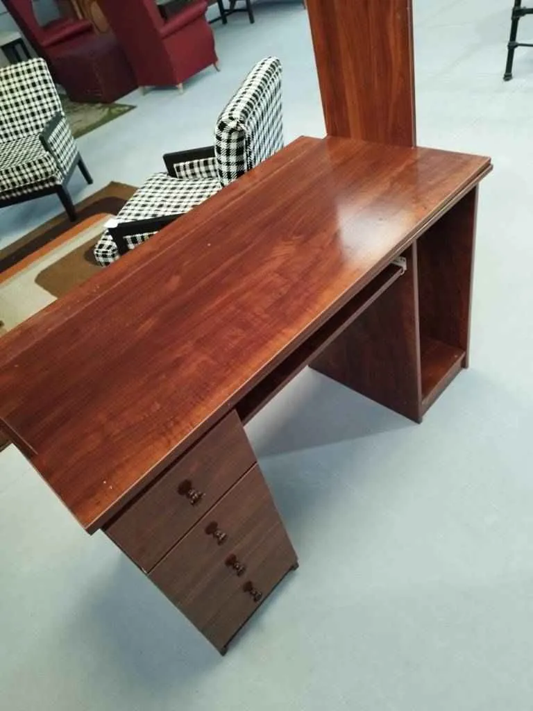 Escritorio hecho de madera de buena calidad y robusta color marrón oscura. Dispone de una cajonera con cuatro cajones en uno de los laterales y de una bandeja extraíble para colocar el teclado y el ratón. También tiene un habitáculo para colocar la torre del ordenador. En la parte superior tiene un estante para colocar documentos o también para usarlo como librería. El mueble se encuentra bien cuidado, aunque a uno de los cajones le falta el embellecedor lateral en la madera.