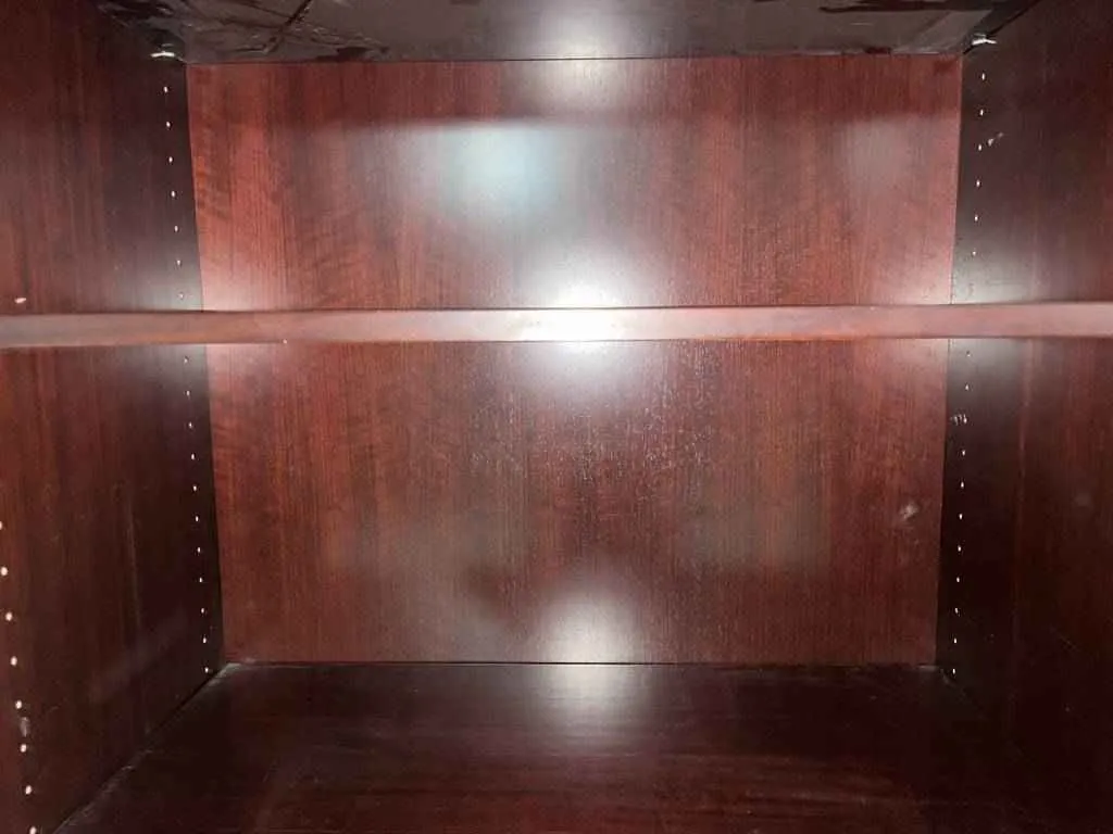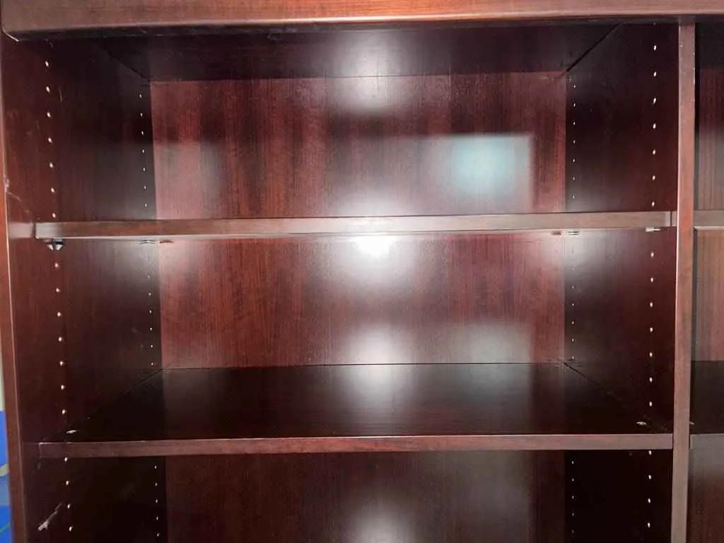 Estantería de gran tamaño, hecha de madera color marrón oscura. Se trata de un estante con multitud de baldas, las cuales se pueden utilizar para almacenaje o también como librería, ya que tienen las medidas perfectas para ello. Todas sus bandas son regulables en altura, para adecuar a cualquier necesidad. Es un mueble perfecto para colocar en un gran despacho o también en la oficina. Se encuentra bien cuidada como se puede ver en las fotografías.