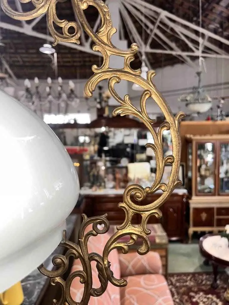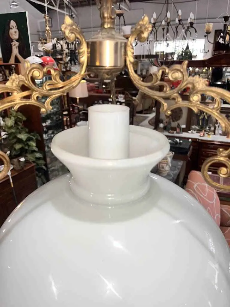 Lámpara antigua colgante con una estructura metálica de color oro envejecido y una tulipa de color blanco. Se trata de una lámpara colgante que tiene un soporte para colgar en forma de eslabones de cadena unidos y tiene una gran tulipa blanca. Es una lámpara ideal para colocarla en un salón comedor de estilo clásico y aportar un toque de distinción a la estancia. Como se ve en las imágenes está en buen estado.