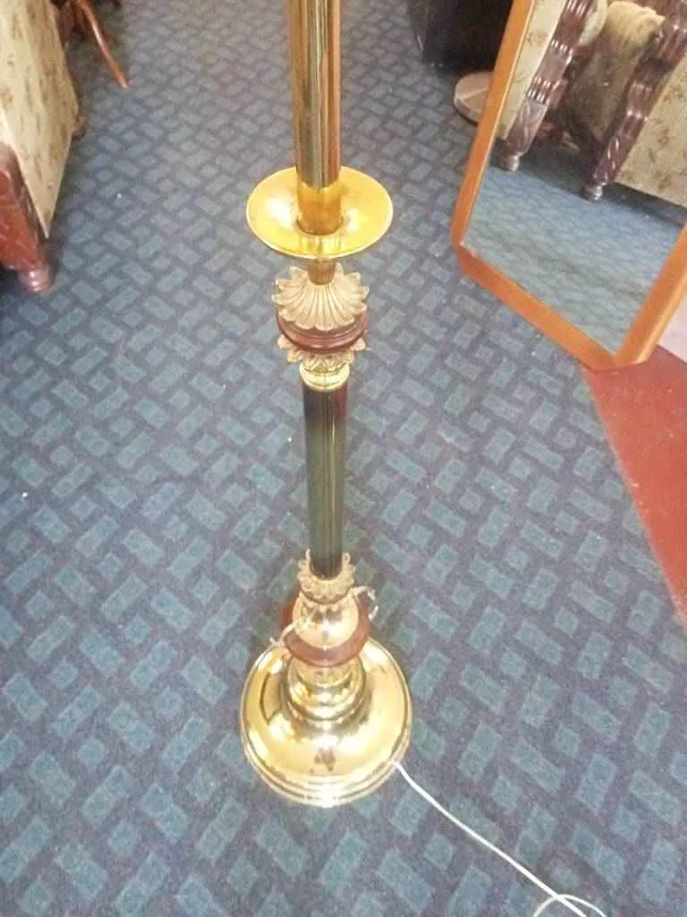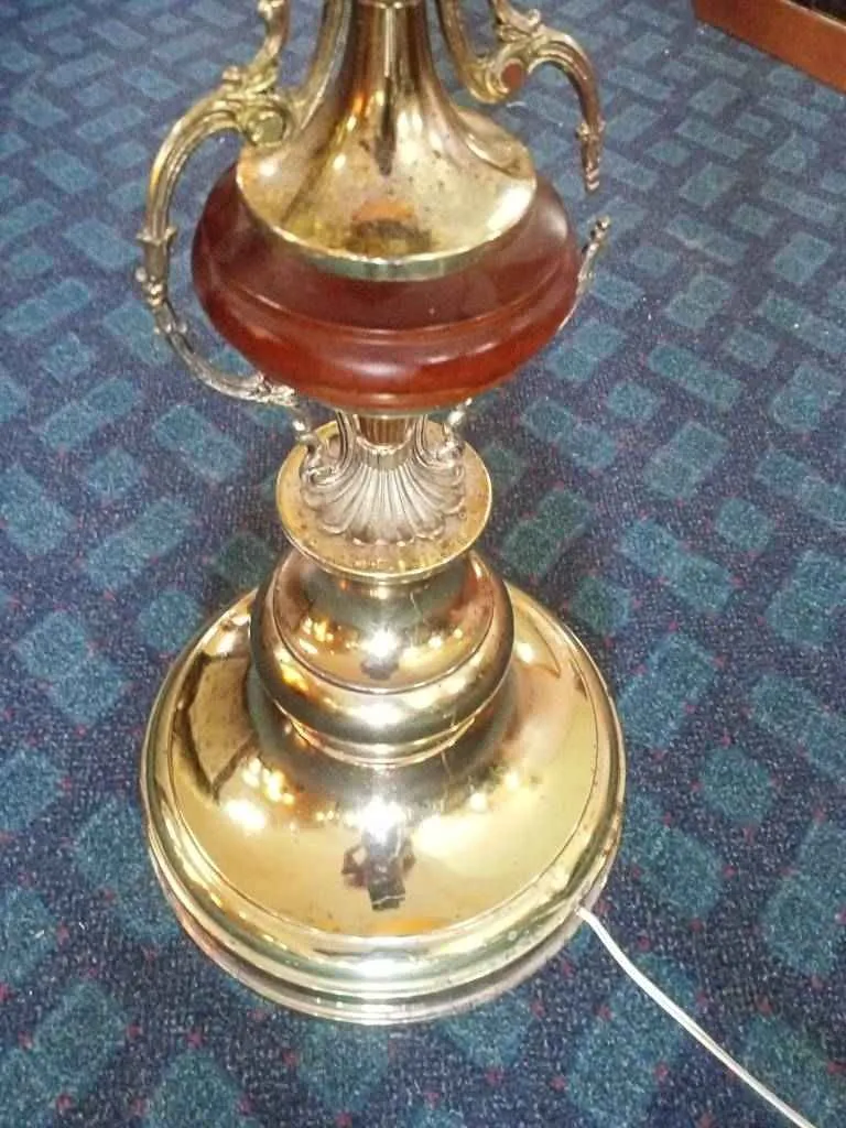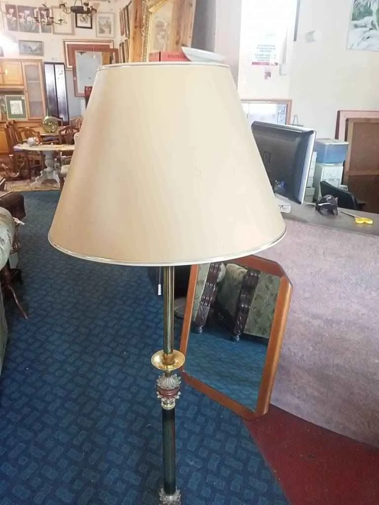 Lámpara de pie de estilo clásico que dispone de un pie muy bonito y elegante con un color dorado y con múltiples formas a modo de flores abiertas que la harán resaltar en nuestro salón comedor. En la parte superior disponen de un punto de luz rodeados de una gran tulipa. Como podemos observar en las fotografías se la tulipa tiene un desperfecto y estaría para cambiar, pero en general, se encuentra en buen estado.